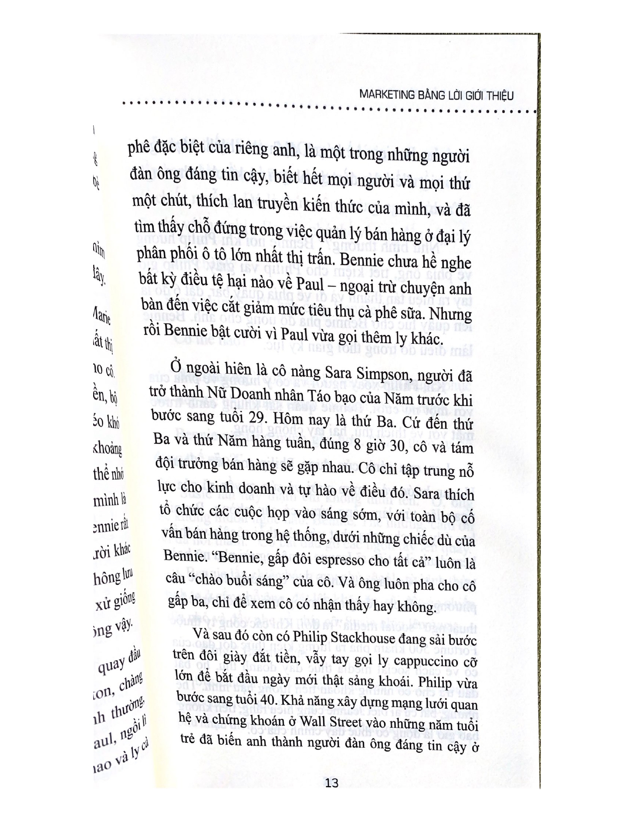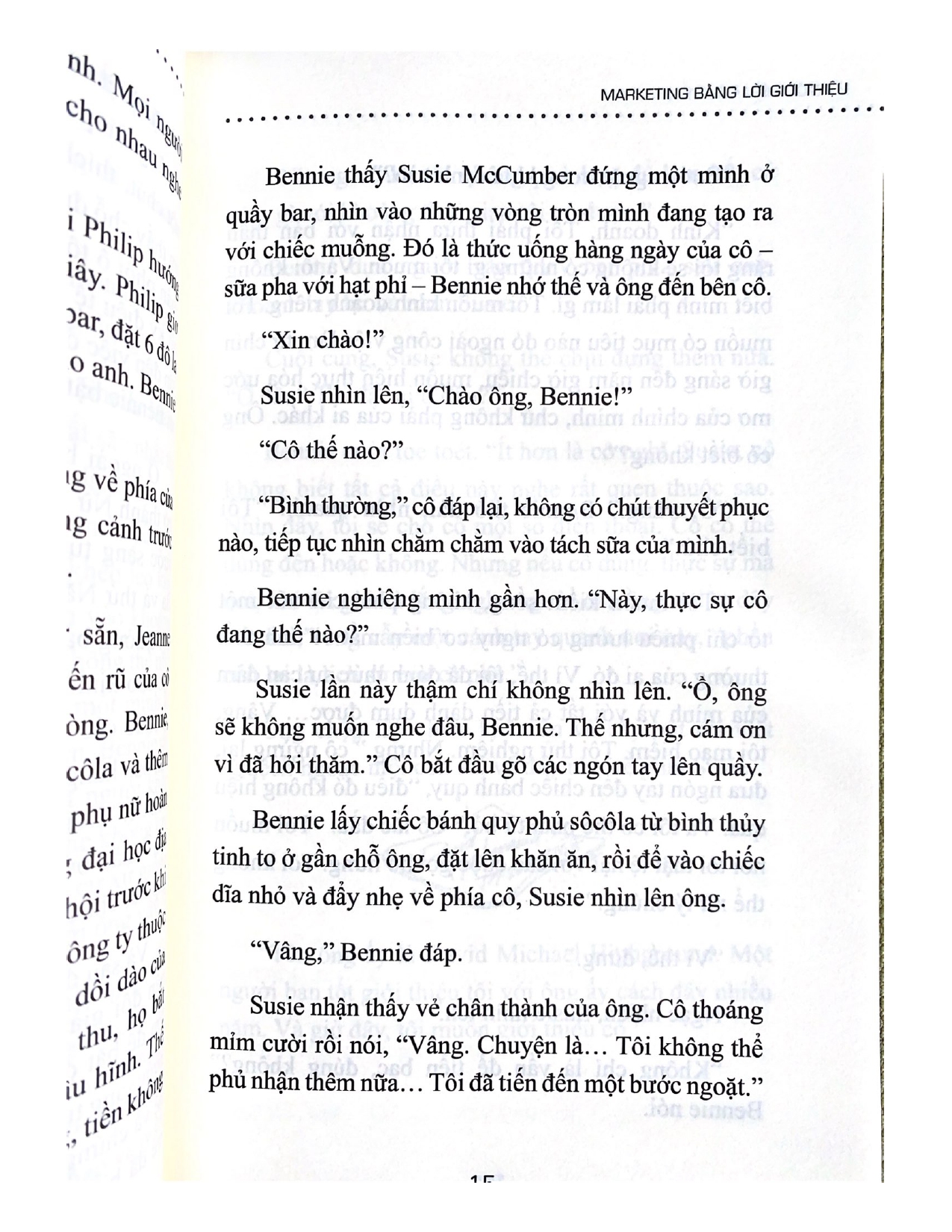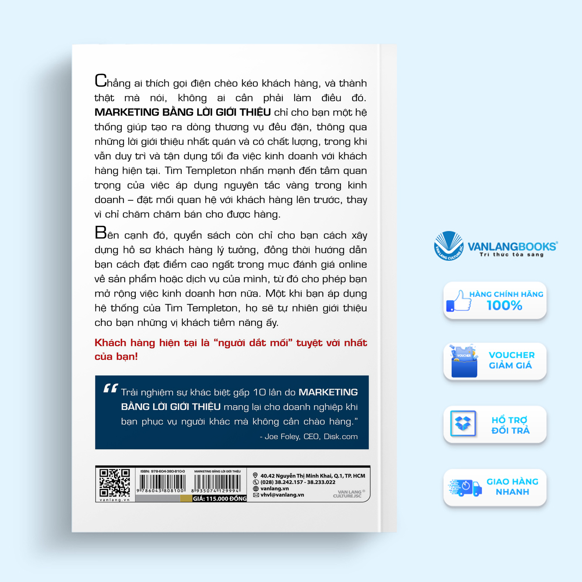 Chẳng ai thích gọi điện chèo kéo khách hàng, và thành thật mà nói, không ai cần phải làm điều đó. Marketing bằng lời giới thiệu chỉ cho bạn một hệ thống giúp tạo ra dòng thương vụ đều đặn, thông qua những lời giới thiệu nhất quán và có chất lượng, trong khi vẫn duy trì và tận dụng tối đa việc kinh doanh với khách hàng hiện tại. Tim Templeton nhấn mạnh đến tầm quan trọng của việc áp dụng nguyên tắc vàng trong kinh doanh – đặt mối quan hệ với khách hàng lên trước, thay vì chỉ chăm chăm bán cho được hàng.