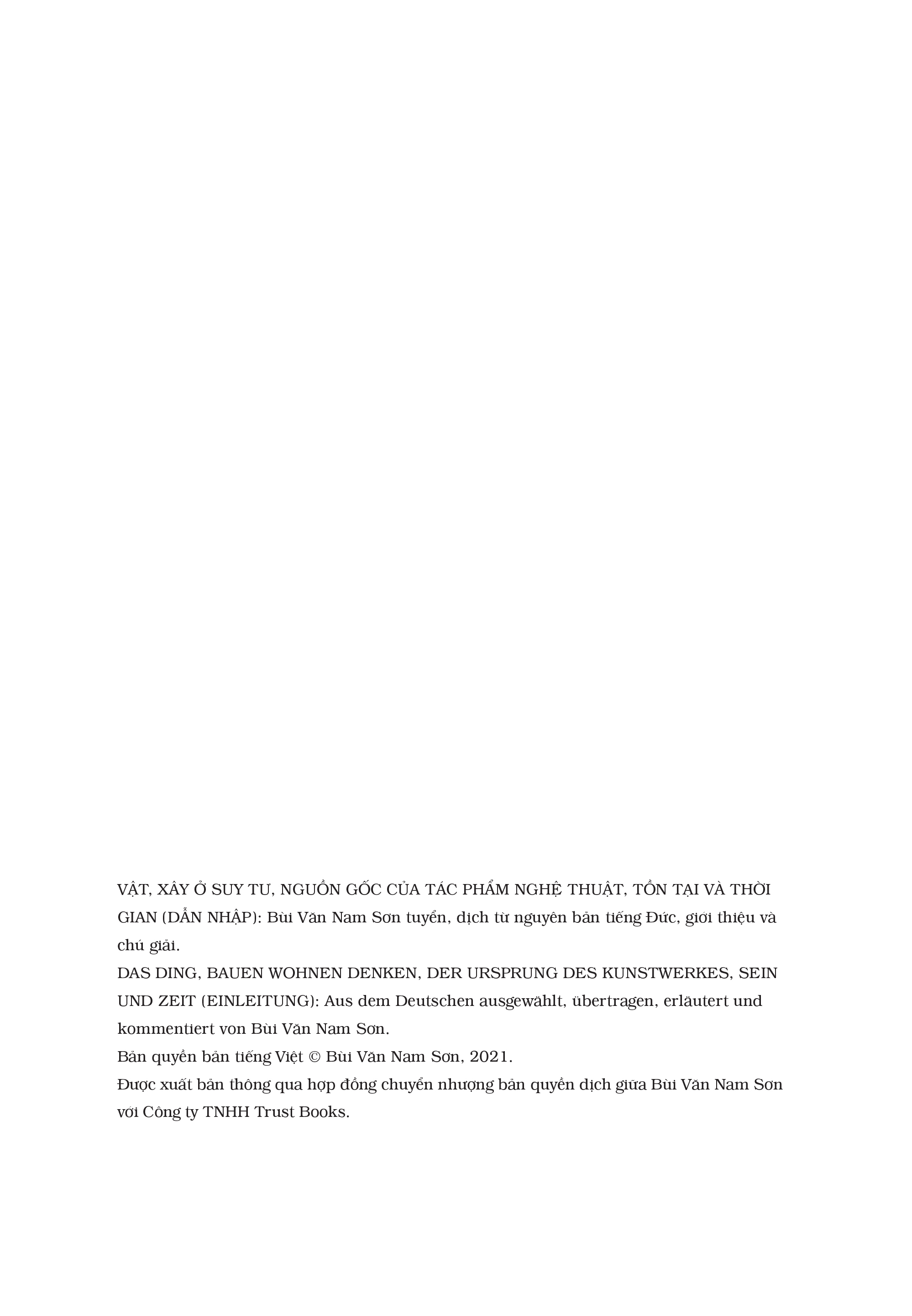 Tập sách này giới thiệu bản dịch (và chú giải) bốn tuyệt phẩm của Martin Heidegger (1989-1976):