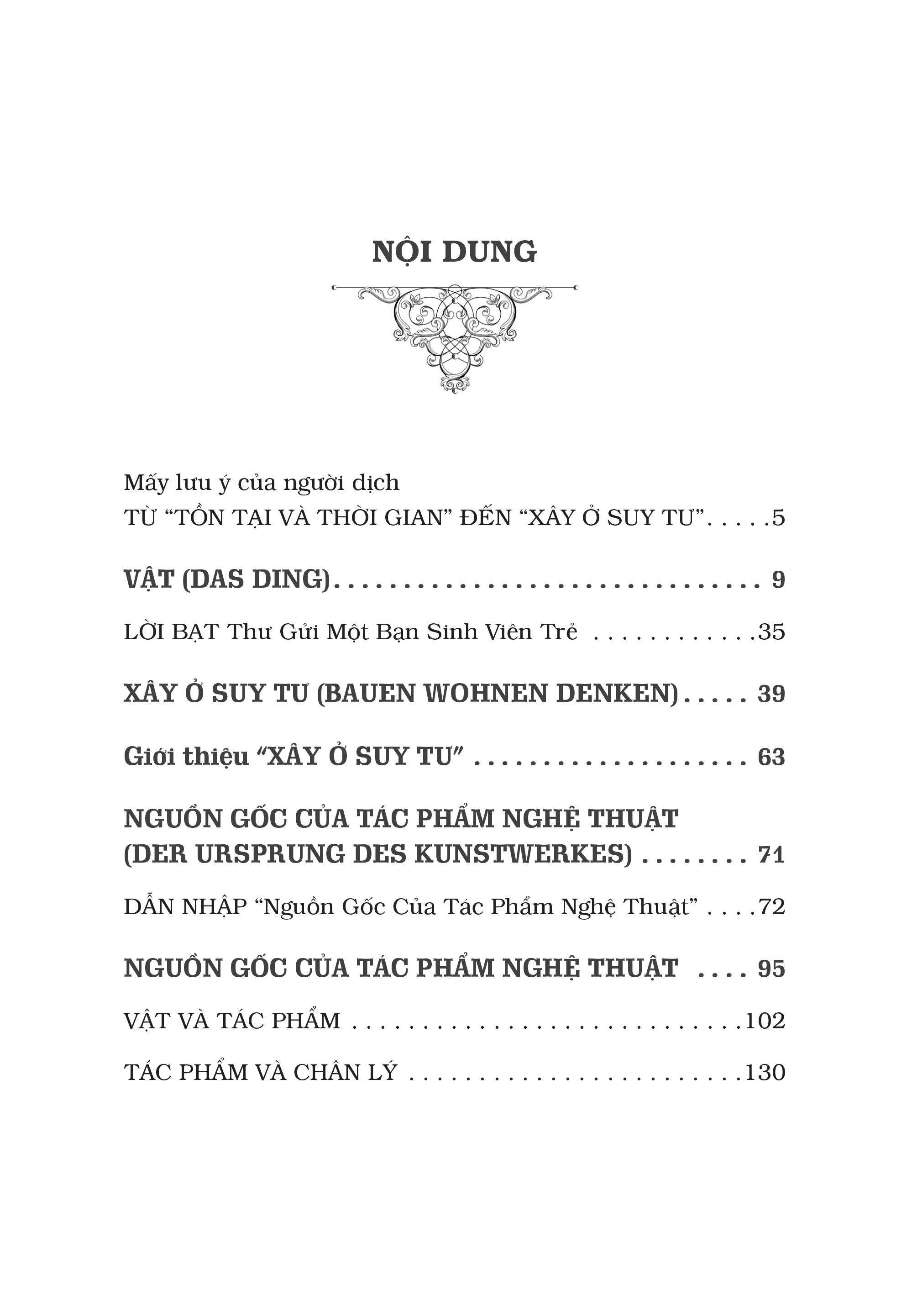 Tập sách này giới thiêu bốn tuyệt phẩm cách nhau 25 năm của Martin Heidegger. Đây là quãng thời gan dài giữa lòng một châu Âu khói lửa với sự hoành hành và sụp đổ của chế độ Đức quốc xã - mà Heidegger có nhiều "duyên nợ" đầy vướng mắc và gây tranh cãi - và những năm tháng đầu tiên của thời kỳ tái thiết hậu chiến của nước Đức. "Hành trình tư tưởng" hay “con đường suy tư” của Heidegger cũng trải qua nhiều biến chuyển trong thời gian ấy, như thể có nhiều Heidegger khác nhau! Bản thân ông xác nhận một "bước ngoặt" hay "khúc quanh" bắt đầu vào năm 1930 (ba năm sau Tồn Tại và Thời Gian (1927) và thời kỳ này chỉ kết thúc khi chuyển sang "suy tư về Ereignis” vào các năm 1936-1938, tức bao hàm cả thời kỳ viết Nguồn gốc tác phẩm nghệ thuật (1955). Vậy, ta có ba chân dung về Heidegger (tất nhiên có liên hệ với nhau): một Heidegger sơ kỳ (trước 1950), một Heidegger trung kỳ hay quá độ (1956-1938) và một Heidegger hậu kỳ (sau 1958). Tuy nhiên, với Xây Ở Suy Tư (1961), dường như có một "bước ngoặt" mới bắt đầu từ 1946, khiến có người (như Julian Young) muốn nhận điện rất có cơ sở thêm một Heidegger thứ tư: Heidegger "hậu chiến". Đó cũng là cách để nhận rõ rằng triết học về nghệ thuật của Heidegger không kết thúc với Nguồn gốc tác phẩm nghệ thuật lừng danh mà còn tiếp tục biến chuyển trong suốt bơn 40 năm tiếp theo từ quá trình “tiếp cận” thi ca và tư tưởng của Hölderlin cho đến các trào lưu nghệ thuật hiện đại và đương đại.