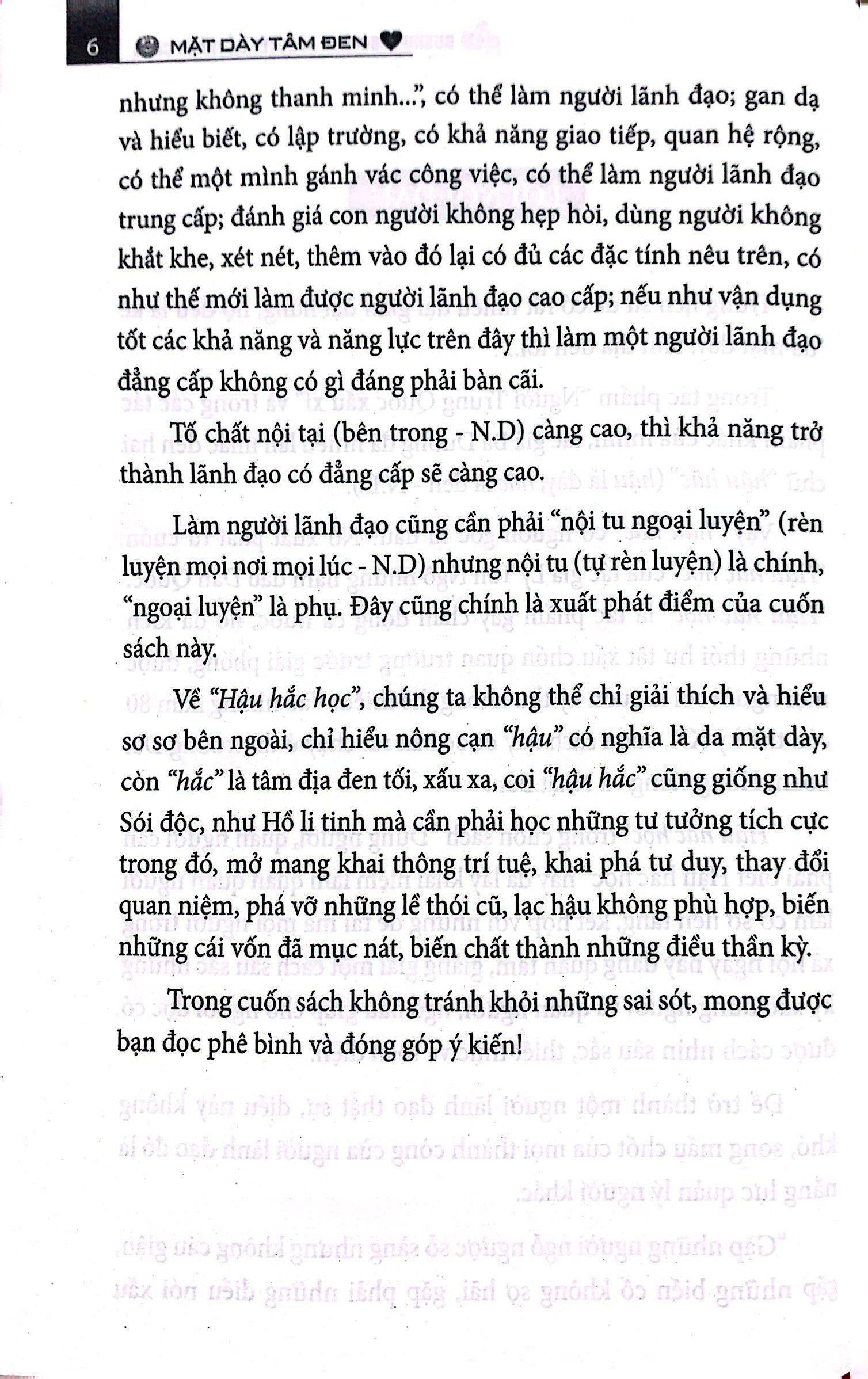 Về Hậu hắc học, chúng ta không thể chỉ giải thích và hiểu sơ sơ bên ngoài, chỉ hiểu nông cạn “hậu” có nghĩa là da mặt dầy, còn “hắc” là tâm địa đen tối, xấu xa, coi “hậu hắc” cũng giống như Sói độc, như Hồ li tinh mà cần phải học những tư tưởng tích cực trong đó, mở mang khai thông trí tuệ, khai phá tư duy, thay đổi quan niệm, phá vỡ những lề thói cũ, lạc hậu không phù hợp, biến những những cái vốn đã mục nát, biến chất thành những điều thần kỳ.