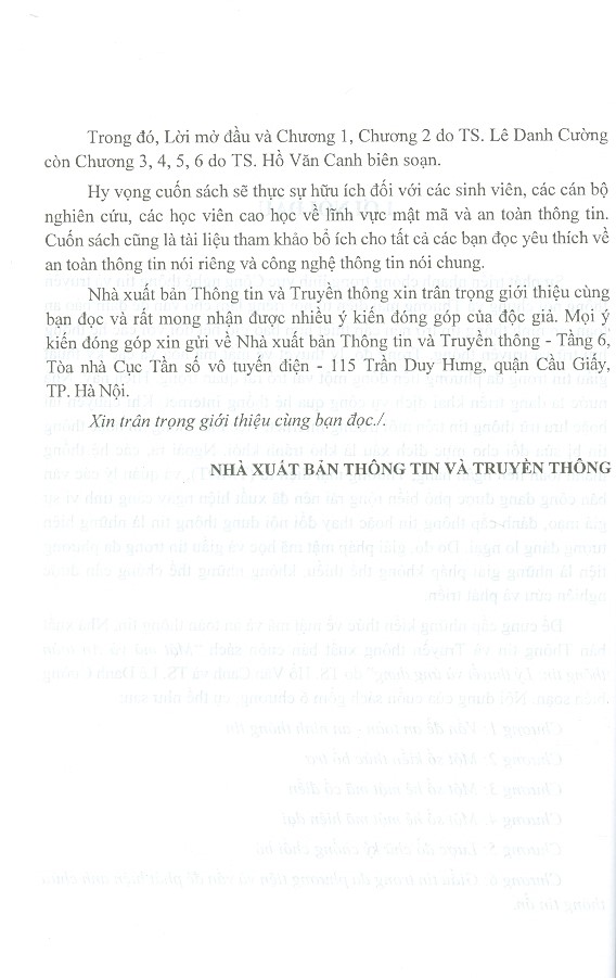 Mua tại TiktokCung cấp các kiến thức về mật mã và an toàn thông tin bao gồm: vấn đề an toàn - an ninh thông tin, một số kiến thức bổ trợ, một số hệ mật mã cổ điển và hệ mật mã hiện đại, lược đồ chữ ký chống chối bỏ, giấu tin trong đa phương tiện và vấn đề phát hiện ảnh chứa thông tin ẩn