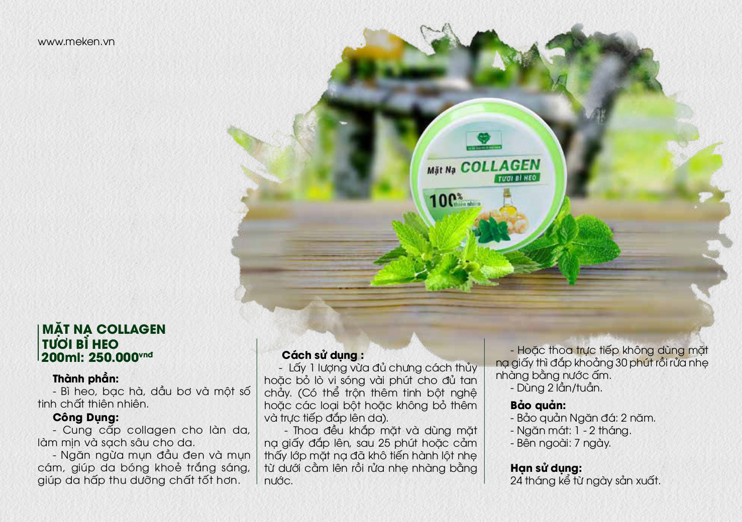 MẶT NẠ COLLAGEN TƯƠI BÌ HEO 200ml - Thành phần : Bì heo, bạc hà, dầu bơ và một số tinh chất thiên nhiên. -CÔNG DỤNG: *Cung cấp collagen cho làn da, làm mịn và sạch