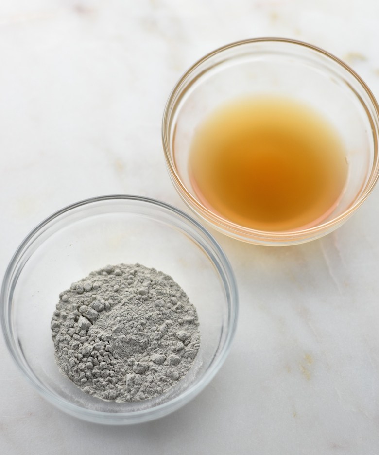 - Mix đều đất sét với nước theo tỉ lệ 1:3, có thể thêm giấm táo Bragg để tăng cường khả năng detox, hỗ trợ trị mụn, giảm nhờ