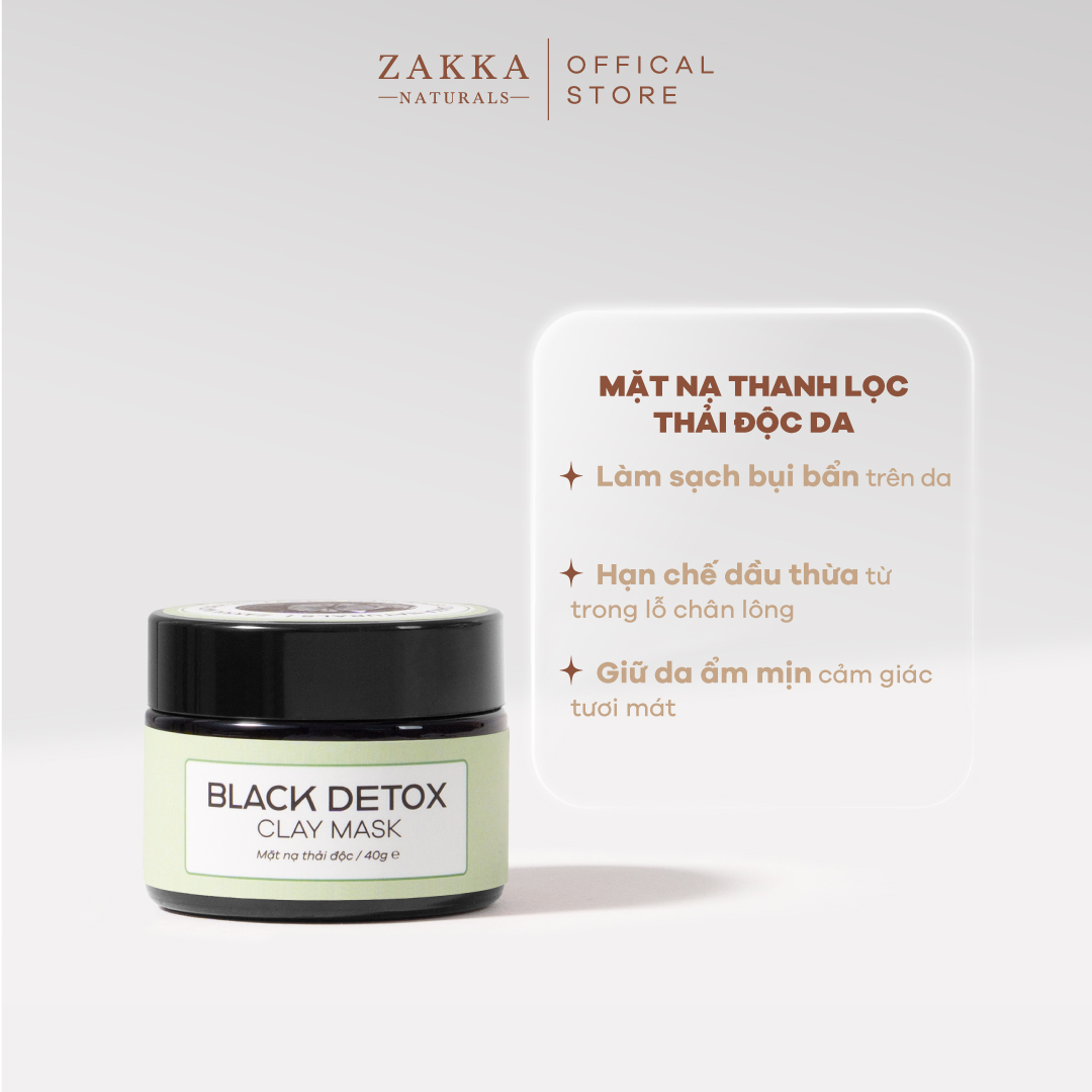 TÊN SẢN PHẨM: Mặt Nạ Zakka Naturals Đất Sét Than Hoạt Tính Thanh Lọc, Thải Độc Da Black Detox Clay Mask 40g GIỚI THIỆU:  Mặt nạ đất sét kết hợp của Than tre hoạt tính Nhật Bản và Đất sét Bentonite giúp hút bã nhờn và tạp chất, bụi bẩn trong bề mặt lỗ chân lông giúp giữ cho da sạch thoáng, mịn màng, hỗ trợ giảm mụn, se khít lỗ chân lông và ngăn ngừa mụn mới. Ngoài ra, mặt nạ giúp thanh lọc da, giúp da khỏe hơn và hấp thu các dưỡng chất trong routine skincare được tối ưu hơn.  Mặt nạ đất sét cho da khô còn chứa chiết xuất cúc La Mã giúp dịu da, giữ da ẩm mịn. Cùng với tinh dầu thiên nhiên (Phong Lữ, Bạc Hà, Lavender...) giúp dưỡng và dịu da, mang lại cảm giác tươi mát, thư giãn, giảm stress hiệu quả trong thời gian đắp mặt nạ. DUNG TÍCH: 40g THÍCH HỢP NHẤT CHO: Dùng cho mọi loại da nhưng thích hợp nhất dành cho: