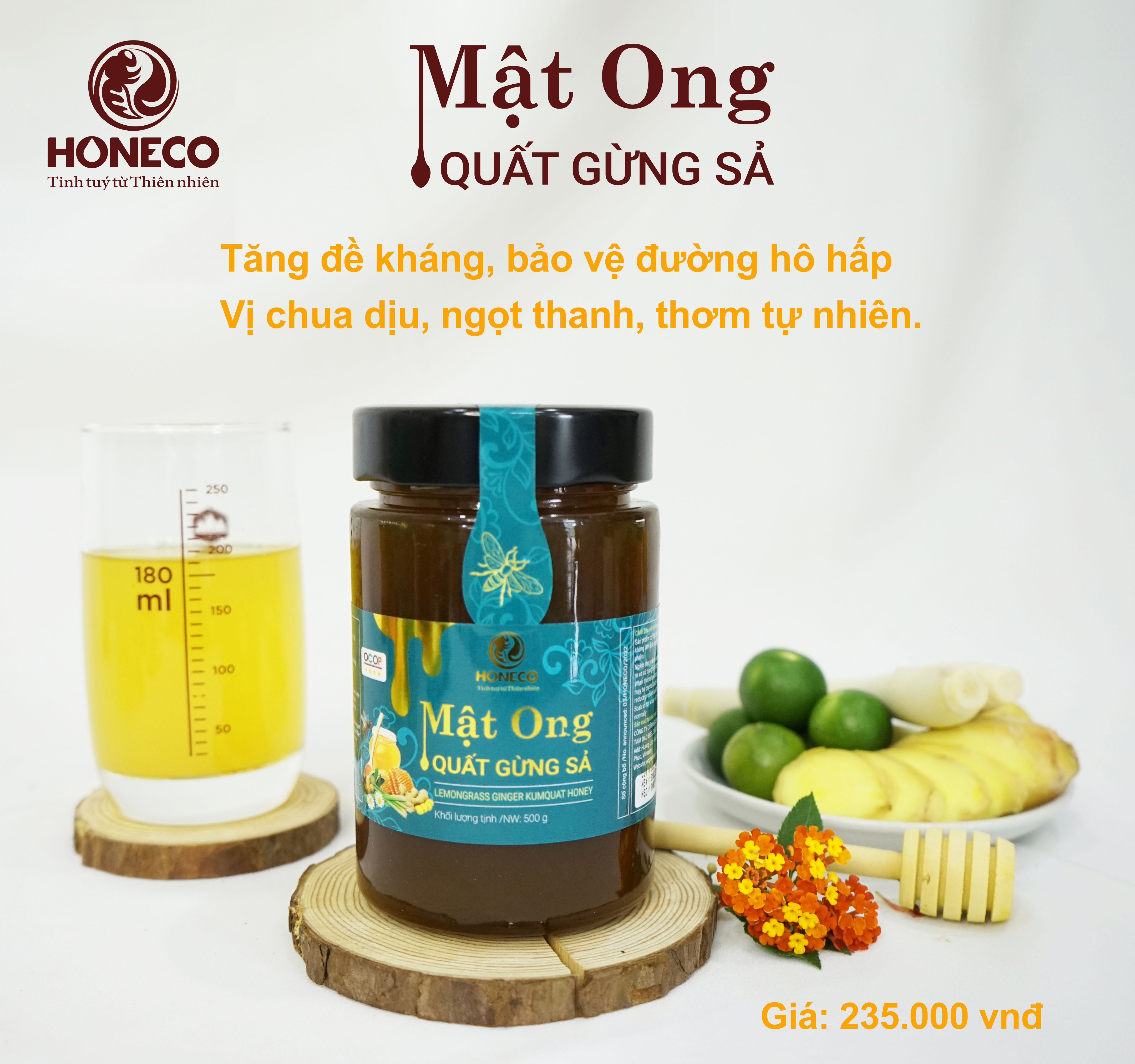 HONECO đã nghiên cứu thành công cho ra đời sản phẩm Mật ong quất gừng sả từ bài thuốc y học cổ truyền.Sản phẩm có vị chua chua ngọt ngọt của quất, thơm của gừng, sả hòa quyện với mật ong tự nhiên ngọt thanh, tạo nên một thứ đồ uống ấm nóng vào mùa đông, mát lạnh vào mùa hè, phù hợp với mọi đối tượng…