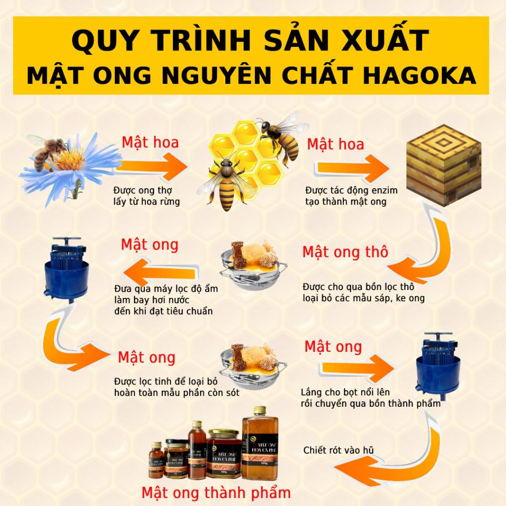 Với sản phẩm tươi sống, trọng lượng thực tế có thể chênh lệch khoảng 10%. Quy trình khai thác Mật Ong Hoa Rừng Nguyên Chất HAGOKA : Những giọt mật thơm ngon vàng óng và