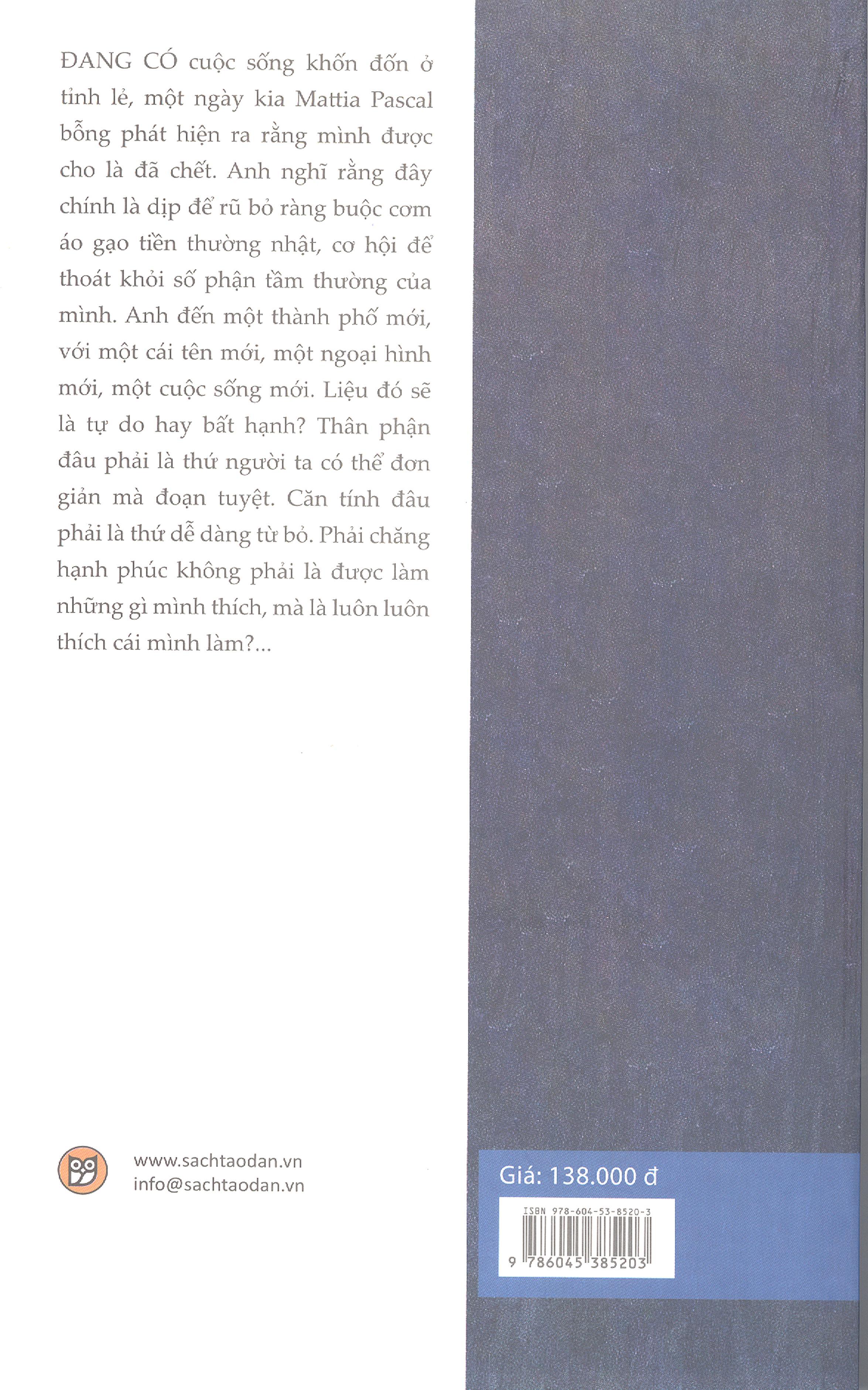 Mua tại TiktokĐANG CÓ cuộc sống khốn đốn ở tỉnh lẻ, một ngày kia Mattia Pascal bỗng phát hiện ra rằng m.ình được cho là đã chết. Anh nghĩ rằng đây chính là dịp để rũ bỏ ràng buộc cơm áo gạo tiền thường nhật, cơ hội để thoát khỏi số phận tầm thường của m.ình. Anh đến một thành phố mới, với một cái tên mới, một ngoại hình mới, một cuộc sống mới. Liệu đó sẽ là tự do hay bất hạnh? Thân phận đâu phải là thứ người ta có thể đơn giản mà đoạn tuyệt. Căn tính đâu phải là thứ dễ dàng từ bỏ. Phải chăng hạnh phúc không phải là được làm những gì m.ình thích, mà là luôn luôn thích cái m.ình làm?