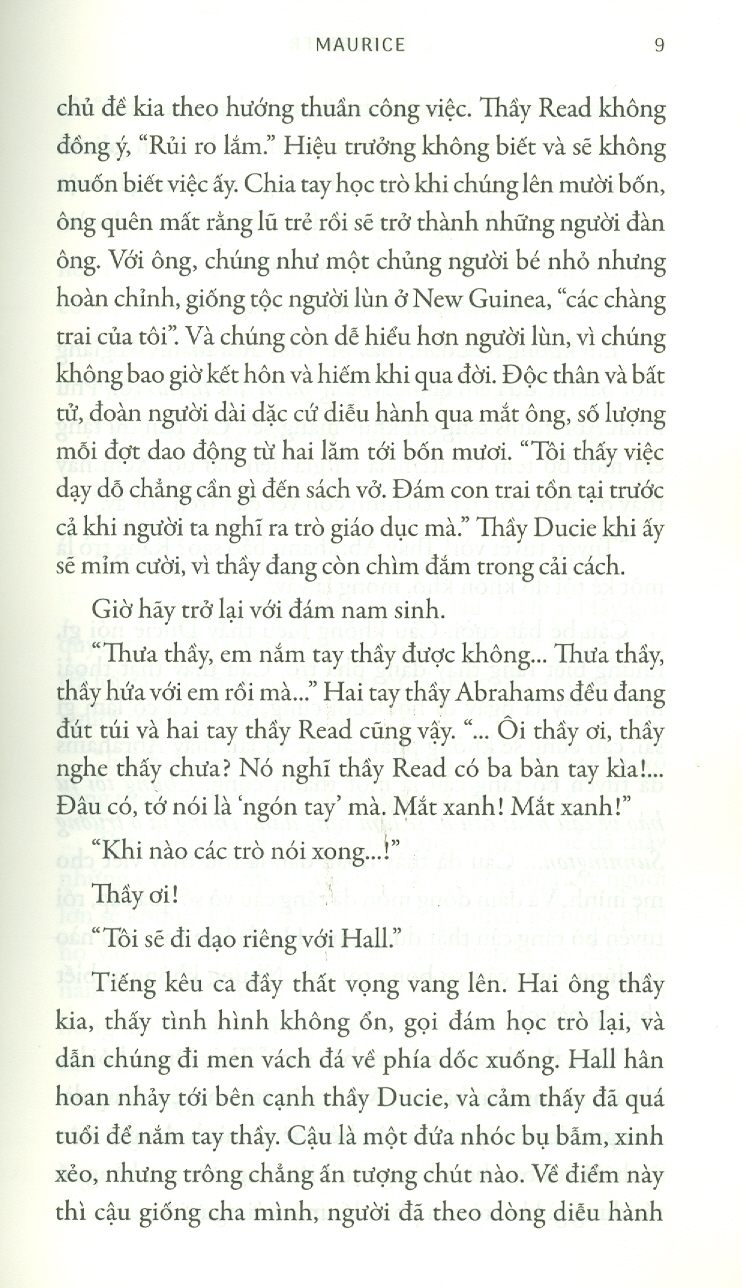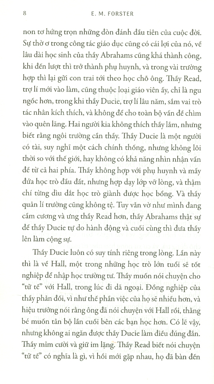 Về tác giả: E. M. Forster (1879 – 1970) là tác giả, nhà phê bình lẫy lừng người Anh, đồng thời là thành viên của Nhóm Bloomsbury. Trong tin cáo phó, tờ The Times đã vinh danh ông là “một trong những tiểu thuyết gia người Anh được yêu mến nhất thời đại này”. Tiểu thuyết Maurice, hoàn thành vào năm 1914, được chỉnh duyệt nhiều lần trong đời Forster, và cuối cùng xuất bản vào năm 1971 sau khi ông qua đời.
