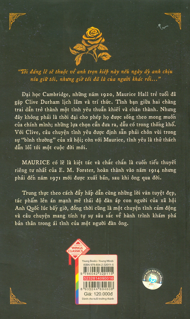 Mua tại Tiktok“Tôi đáng lẽ sẽ thuộc về anh trọn kiếp này nếu ngày ấy anh chịu níu giữ tôi, nhưng giờ tôi đã là của người khác rồ” Đại học Cambridge, những năm 1920, Maurice Hall trẻ tuổi đã gặp Clive Durham lịch lãm và trí thức. Tình bạn giữa hai chàng trai dần trở thành một tình yêu thuần khiết và chân thành. Nhưng đây không phải là thời đại cho phép họ được sống theo mong muốn của chính mình; những lựa chọn cần đưa ra, dẫu có trong thống khổ. Với Clive, câu chuyện tình yêu được định sẵn phải chôn vùi trong sự “bình thường” của xã hội; còn với Maurice, tình yêu là thử thách dẫn lối tới một cuộc đời mới. MAURICE có lẽ là kiệt tác và chắc chắn là cuốn tiểu thuyết riêng tư nhất của E. M. Forster, hoàn thành vào năm 1914 nhưng phải đến năm 1971 mới được xuất bản, sau khi ông qua đời. Trung thực theo cách đầy hấp dẫn cùng những lời văn tuyệt đẹp, tác phẩm lên án mạnh mẽ thái độ đàn áp con người của xã hội Anh Quốc lúc bấy giờ, đồng thời cũng là một chuyện tình cảm động và câu chuyện mang tính tự sự sâu sắc về hành trình khám phá bản thân trong ái tình của một người đàn ông.