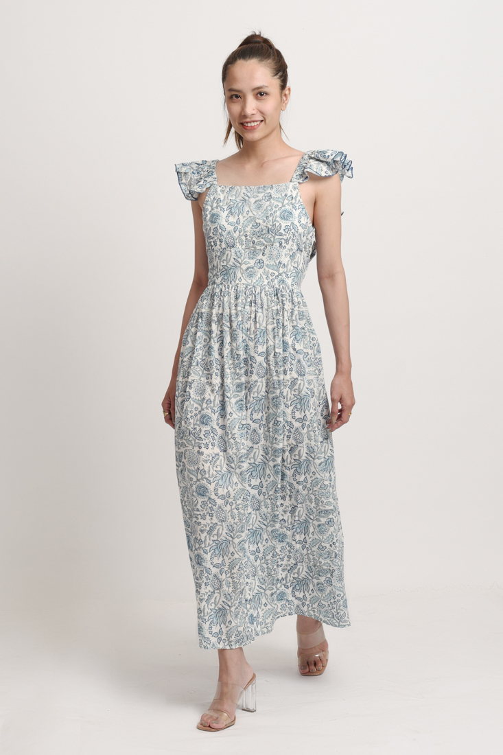Maxi Cánh Dơi Hoa Cotton Isla Bonita, chất liệu lụa cao cấp, mềm mại, thoáng mát. Xẻ tà 2 bên. Hoa xanh nổi bật trên nền vải trắng. Đầm cánh dơi, phom rộng freestyle. Dài