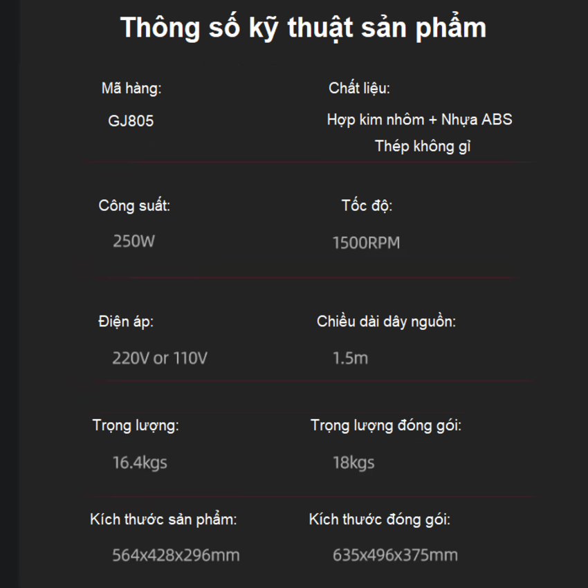 Dung tích: 2L Công suất: 250W Nguồn điện : 220v- 50Hz Vỏ máy: Chất liệu Inox 304 cao cấp, chịu nhiệt Lưỡi dao: Thiết kế 4 lưỡi bằng thép không gỉ – Sắc bén cho