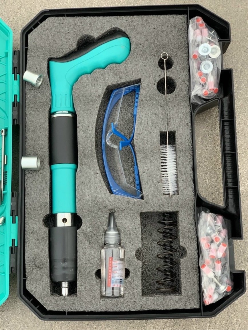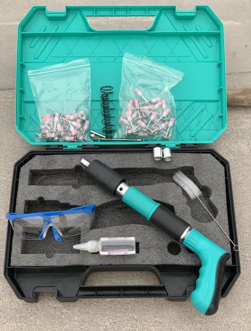 Bộ sản phẩm gồm: một máy bắn đinh + 50 con đinh ty dù thẳng + 1 kính bảo hộ + phụ kiện thay thế