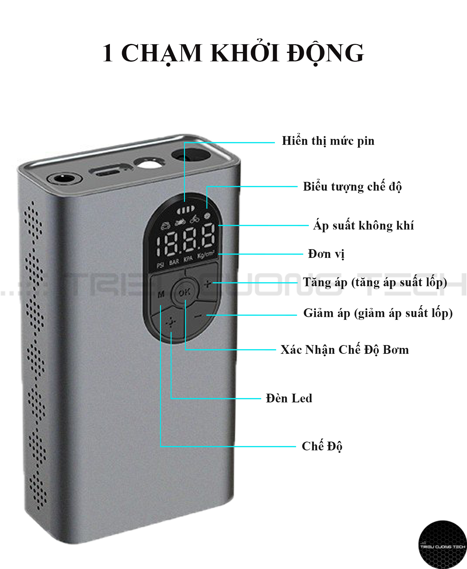 THÔNG SỐ SẢN PHẨM - Model: CQB04 - Kích thước sản phẩm: 14.1*8*4cm - Kích thước dây: 20cm - Dung lượng pin: 2000mAh - Phạm vi áp suất không khí: 0.2-8bar / 3-150psi - Input: