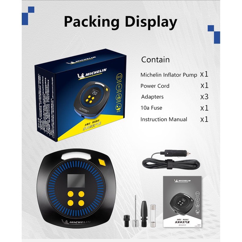 GIỚI THIỆU SẢN PHẨM Chuỗi máy bơm Michelin mới sử dụng kiểu mới QRV (Quick Release Valve: Van Xả Nhanh) với thiết kế độc nhất và công nghệ tiên phong. Chúng tôi luôn cam kết tập trung vào nghiên cứu và phát triển công nghệ, cải tiến sản phẩm và mang đến trải nghiệm tốt cho người tiêu dùng cũng như hỗ trợ khẩn cấp an toàn cho người tiêu dùng trên thế giới. Sản phẩm này thích hợp để bơm lốp xe hơi, xe đạp, xe máy và các vật dụng áp suất thấp như banh thể thao và các đồ chơi bơm hơi nhỏ. Đèn pha với thiết kế độc nhất giúp bạn lái xe ra khỏi chỗ tối và làm việc bình thường ở những nơi thiếu ánh sáng. VUI LÒNG ĐỌC KỸ HƯỚNG DẪN SỬ DỤNG TRƯỚC KHI SỬ DỤNG MÁY BƠM VÀ CHÚ Ý CÁC NHẮC NHỞ VÀ CẢNH BÁO. 1. Vui lòng đọc hướng dẫn sử dụng. Sử dụng không đúng cách có thể gây thương tích và làm hư hỏng máy. 2. Áp suất lốp đúng rất quan trọng để đảm bảo an toàn cho bạn và an toàn giao thông. 3. Lốp quá căng hay quá mềm có thể gây nguy hiểm. Luôn kiểm tra áp suất lốp xe định kỳ hàng tuần theo áp suất do nhà sản xuất xe khuyến nghị, 4. Luôn kiểm tra áp suất lốp ở điều kiện nhiệt độ bình thường. Không kiểm tra áp suất lốp ngày sau hành trình dài. Bạn nên để lốp xe nguội đi trong ít nhất 30 phút trước khi đo áp suất lốp. 5. Luôn sử dụng máy bơm ở nơi an toàn, tránh xa đường giao thông và các nơi nguy hiểm khác. 6. Kiểm tra máy bơm trước khi sử dụng, phạm vi áp suất máy bơm từ 0-145 psi. 7. Không được vận hành máy bơm liên tục quá 10 phút. Sau mỗi 10 phút vận hành, hãy để máy bơm nguội đi trong vòng 10 phút. 8. Ống mềm bơm lốp sẽ bị nóng lên khi bơm lốp. Khi sử dụng thì không đụng vào để tránh bị bỏng. Máy bơm này được trang bị cách nhiệt và gia tăng bảo vệ cho các bộ phận của ống mềm bơm lốp có nhiệt độ cao, hãy chú ý sử dụng. 9. Không được gấp hoặc làm tắc ống mềm bơm lốp trong khi vận hành máy bơm. 10. Không sử dụng máy bơm khi máy bơm bị biến dạng, hư hỏng, nóng chảy, cháy, ngâm trong nước hoặc khi có bất kỳ bộ phận nào bị hư. 11. Không sử dụng máy bơm nếu có âm thanh bất thường hoặc nhiệt độ tăng cao trong khi vận hành máy bơm. 12. Không cho trẻ em sử dụng máy bơm. Phải giám sát trẻ em để đảm bảo rằng trẻ em không nghịch máy bơm. 13. Trẻ em không được sử dụng các linh kiện để tránh thương tích. 14. Không có linh kiện để người sử dụng tự thay thế - KHÔNG ĐƯỢC MỞ. Nếu không tuân thủ thì có thể vô hiệu bảo hành, ngoại trừ việc thay pin. 15. Luôn chú ý máy bơm trong khi sử dụng. 16.Không sử dụng máy bơm trong khi đang sạc. THÔNG TIN KỸ THUẬT Thương hiệu: Michelin/ Michelin Mô hình: M2208S PIN: 10.8 V DC/ 2500 m Ah Công suất: 80W Phạm vi áp suất : 0-- 145psi Đơn vị đo áp suất: psi / bar / kpa Chiều dài ống bơm 20cm ĐÈN COB 3W Thông số xi lanh: xi lanh đơn Đối tượng áp dụng: lốp xe đạp, lốp ô tô thông thường, bóng, xe điệ