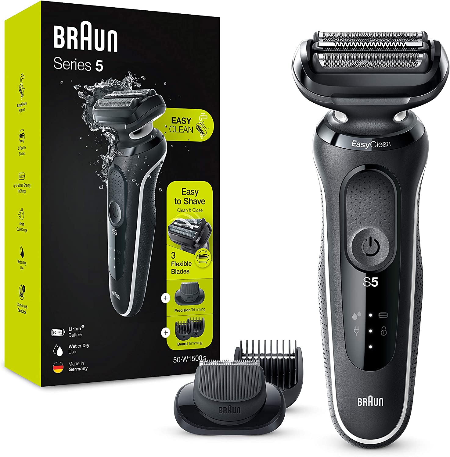 Máy cạo râu Braun Serie 5 50-W1500s Dao cạo điện với 3 Lưỡi dao linh hoạt thích ứng với các đường nét trên khuôn mặt để cạo sát dễ dàng Hệ thống EasyClean giúp làm sạch nhanh chóng và dễ dàng mà không cần tháo đầu máy cạo râu Pin Li-Ion cho thời gian cạo râu lên đến 3 tuần (50 phút). Sạc nhanh trong 5 phút cho một lần cạo râu hoàn toàn Dao cạo điện không thấm nước 100% để sử dụng ướt & khô Bao gồm phần đính kèm Máy tỉa râu cho các kiểu râu từ 0,5mm đến 7mm Cạo sát dễ dàng và dễ dàng: Máy cạo râu điện Series 5 mới thích ứng với các đường nét trên khuôn mặt của bạn với 3 lưỡi linh hoạt. Nâng cấp với EasyClick. Bạn có thể dễ dàng tháo lắp các phụ kiện đi kèm. Bao gồm một phần đính kèm Beard Trimmer cho các kiểu râu từ 0,5mm đến 7mm. Dễ dàng xử lý: Tay cầm công thái học mới cho phép cạo râu dễ dàng với chuyển động một chiều, đơn giản. Pin Li-Ion bền lâu hơn: 1 lần sạc đầy mang lại giá trị cạo lên đến 3 tuần. Sạc nhanh 5 phút là đủ cho 1 lần cạo râu. 100% không thấm nước cho sử dụng ướt & khô: Được thiết kế để cạo khô, với bọt, gel và trong khi tắm.