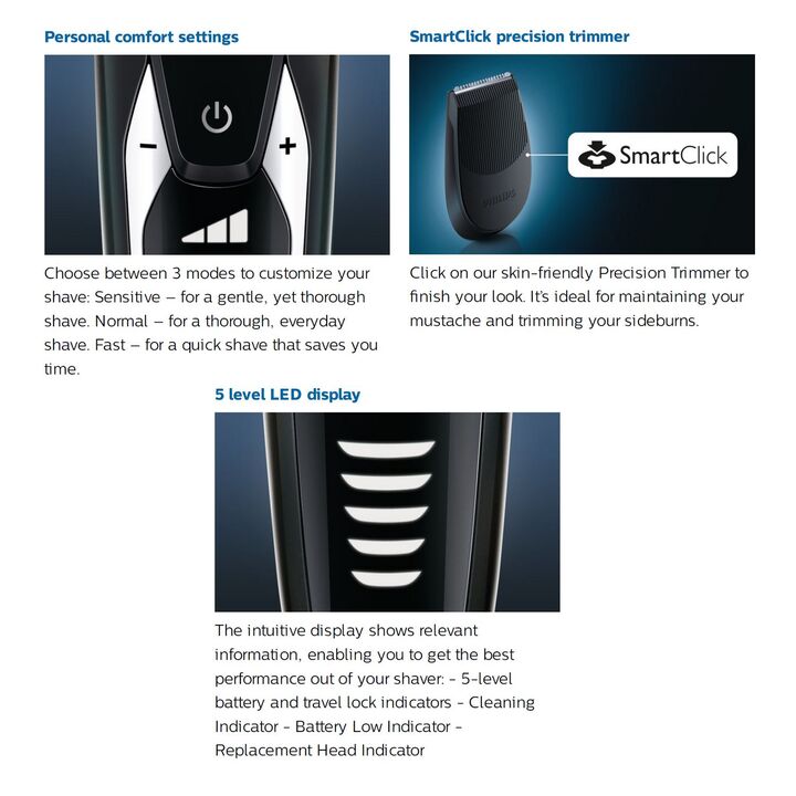 Cạo sát không lo tổn hại làn da với Công nghệ SkinIQ Lưỡi cạo SteelPrecision Cảm biến bộ điều hợp nguồn Đầu cạo linh hoạt 360 độ Đầu tỉa tóc mai và ria mép tích