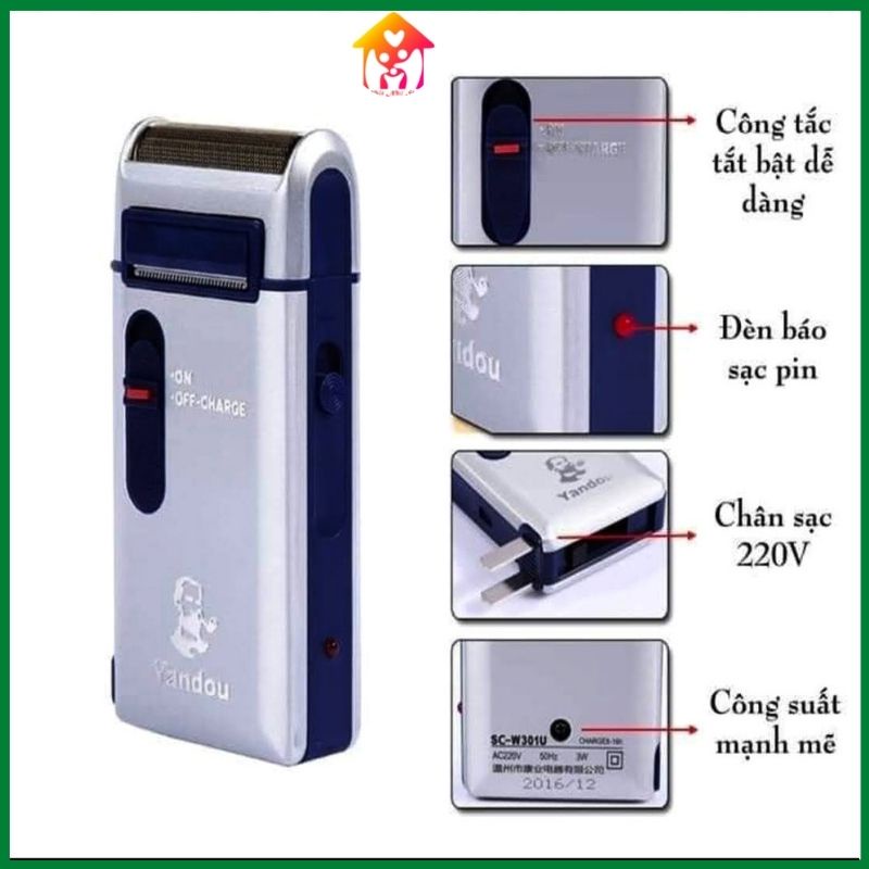 Pin dung lượng: 800mAh(30phút) Công suất: 3W Điên áp: 220V Làm sạch: Cạo khô Có lưỡi cắt tỉa Kích thước: 51 x 24x 106 mm Trọng lượng: 175g An toàn khi sử dụng: không trầy