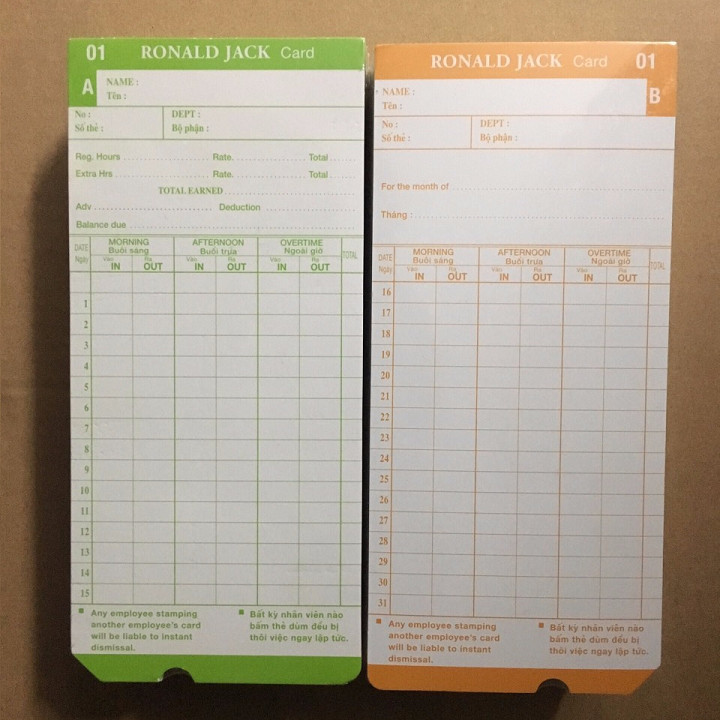 1/Thẻ giấy chấm công 3 ca hiệu Ronald Jack, sử dụng được cho nhiều loại máy chấm công thẻ giấy hiện nay chất liệu : giấy bìa cứng cáp, in màu hai mặt 2/Kệ