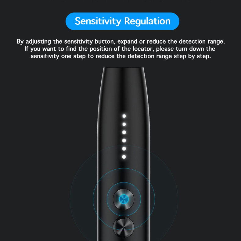 - Chuyển chế độ (nút dưới): Có 3 chức năng: 1: chế độ dò sóng wifi (để dò những thiết bị phát sóng wifi), 2: chế độ full band (là chế độ dò sóng RF Radio, Wifi), 3: Chế độ dọi đèn (chế đọ này xử dụng dò camera)