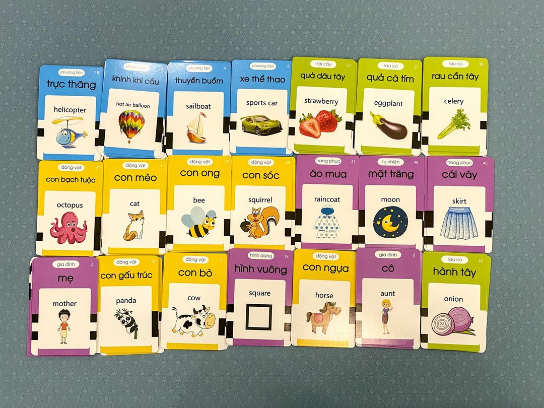 * Mô tả sản phẩm : - Số lượng thẻ: 100 thẻ/bộ với 14 chủ đề đa dạng khác nhau như : màu sắc và hình khối, gia đình, động vật nuôi, rau củ quả,