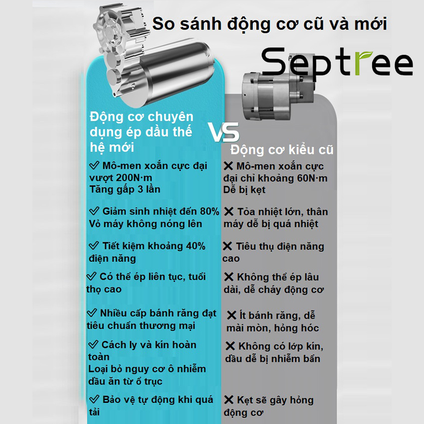 - Vấn đề sức khỏe hiện nay đang rơi vào tình trạng đáng báo động khi, các chủ cơ sở sản xuất, hộ kinh doanh dầu ăn chỉ chạy theo lợi nhuận mà bất chấp cung cấp ra thị trường các loại dầu ăn giả, kém chất lượng, gây tổn hại đến sức khỏe và tính mạng người tiêu dùng. Cách tốt nhất bảo vệ bản thân và mọi người trong gia đình đó chính là tự ép dầu thực vật ngay tại nhà. Giới thiệu máy ép dầu thực vật hoàn toàn mới, thế hệ thứ 4 Septree R8S Máy ép dầu thực vật hoàn toàn mới, thế hệ thứ 4 Septree R8S với tính năng ưu việt như: Xả dầu bên hông, momen xoắn 200nM, cảnh báo quá tải và tự động đảo chiều, cảm biến nhiệt tiên tiến....