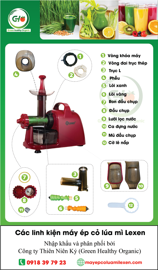 Máy ép chậm Lexen là một trong những sản phẩm gia dụng chất lượng của công ty hàng đầu thế giới tại Hong Kong. Từ lâu hãng Lexen nổi tiếng tại Mỹ và các nước châu âu. Trong những năm gần đây được cộng đồng dinh dưỡng xanh và người tiêu dùng Việt Nam tìm kiếm và tin dùng Với mong muốn mang đến nguồn dinh dưỡng xanh – Sống khỏe mạnh, Công ty Thiên Niên Kỷ đã nhập khẩu, phân phối và bảo hành máy tại Việt Nam. Đặc điểm máy ép cỏ lúa mì Lexen – Chất liệu: Trục thép không gỉ, mũi khoan xoắn bằng nhựa POM, an toàn BPA. –  Là dòng máy ép chuẩn, không bị sinh nhiệt trong lúc ép do vòng xoay 76 RPM thấp, do đó giúp giữ nguyên vitamin, enzyme, khoáng chất tươi của nước ép. – Hạn chế tối đa bị kẹt máy. – Máy có độ bền cao, chắc chắn, ít hư hỏng. – Tiện lợi, an toàn cho mọi lứa tuổi lắp ráp, sử dụng và vệ sinh. Công dụng của máy ép cỏ lúa mì Lexen – Máy được thiết kế đặc biệt bởi 2 lõi khoan: