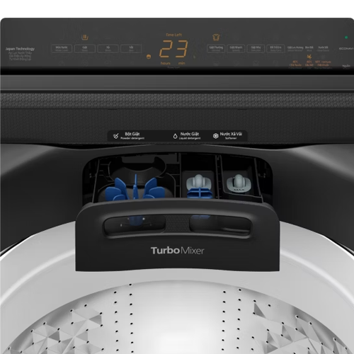 Tổng quan Loại máy giặt:Cửa trên Lồng giặt:Lồng đứng Khối lượng giặt:12 Kg Số người sử dụng:Trên 7 người Kiểu động cơ:Truyền động gián tiếp (dây Curoa) Chất liệu lồng giặt:Thép không gỉ Chất liệu vỏ máy:Kim loại sơn tĩnh điện Chất liệu nắp máy:Kính Sản xuất tại:Thái Lan Năm ra mắt:2024 Thời gian bảo hành động cơ:10 năm Mức tiêu thụ điện năng Hiệu suất sử dụng điện:7 Wh/kg Loại Inverter:Smart Inverter Công nghệ giặt Chương trình: Đồ trải giường Giặt sơ + Thông thường Đồ tinh xảo Vệ sinh lồng giặt Giặt nhanh Giặt thông thường Công nghệ giặt: Giặt xoay chiều TurboDrum Bảng điều khiển và Tiện ích Bảng điều khiển:Song ngữ Anh - Việt nút nhấn có màn hình hiển thị Tiện ích: Thêm đồ trong khi giặt Khóa trẻ em Âm báo Thông tin lắp đặt Kích thước - Khối lượng:Cao 97 cm - Ngang 63.2 cm - Sâu 67 cm - Nặng 39 kg Chiều dài ống cấp nước:140 cm Chiều dài ống thoát nước:120 cm