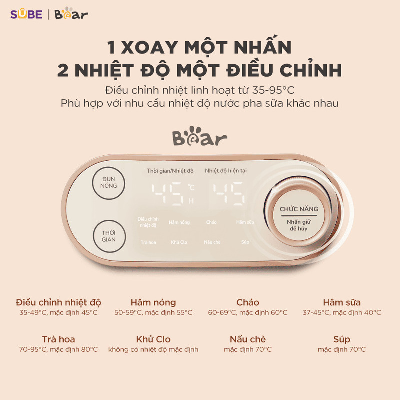 Có máy đun nước hâm sữa Bear WW-5H12N trong tay, mẹ dễ dàng hâm sữa đúng nhiệt độ 45°C, không lo nhiệt quá cao làm ảnh hưởng đến chất lượng sữa. Hay khi cần pha sữa công