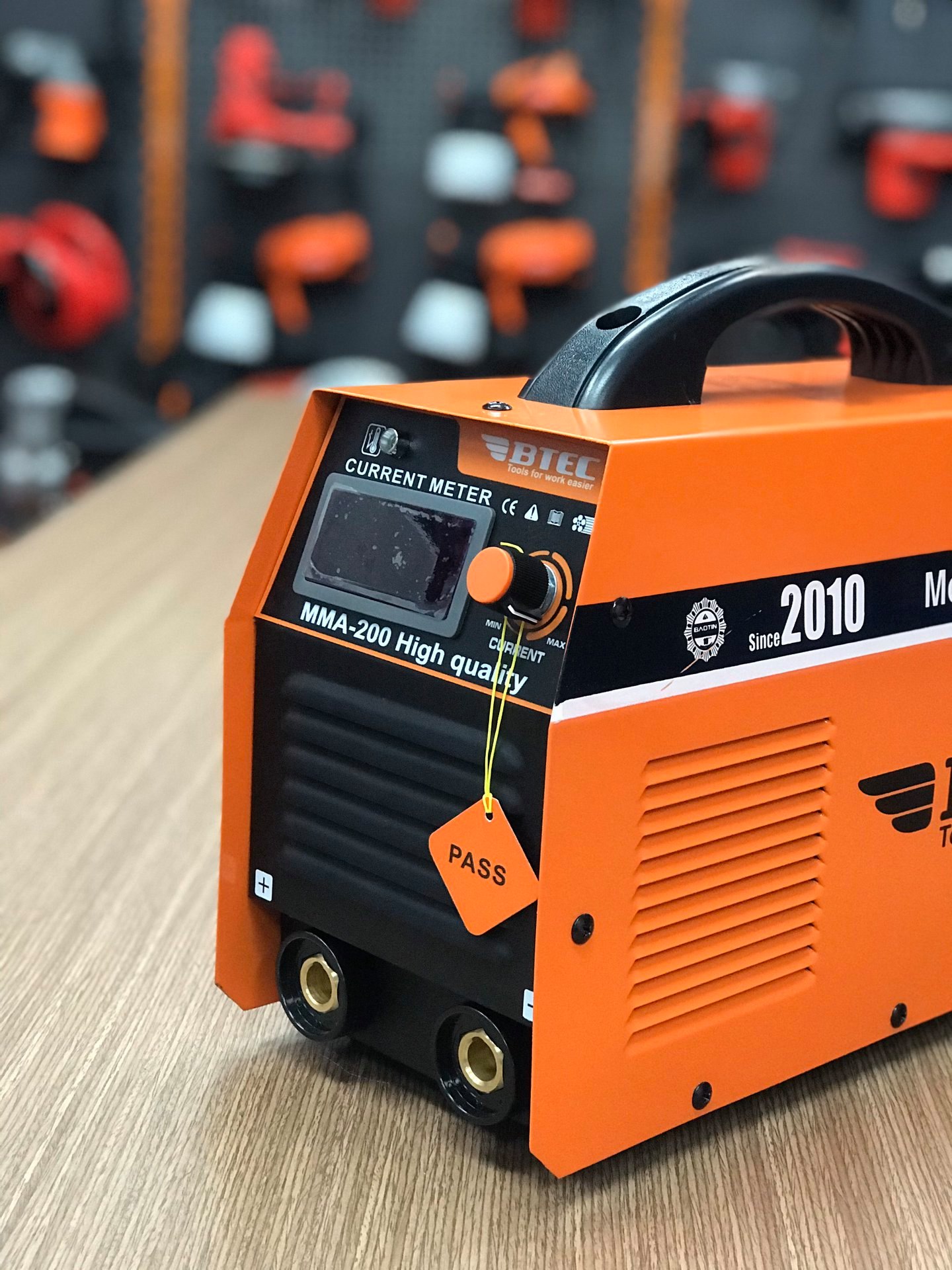 Mặt trước của máy hàn điện tử BTEC MMA-200 (xác lớn): 2 giác cắm dây hàn và dây mass đều là giác lớn, mã máy ( MMA-200 High quality), đồ hồ hiện thị dòng ra, núm điều chỉnh dòng hàn, đèn báo khi máy làm việc quá hiệu suất.