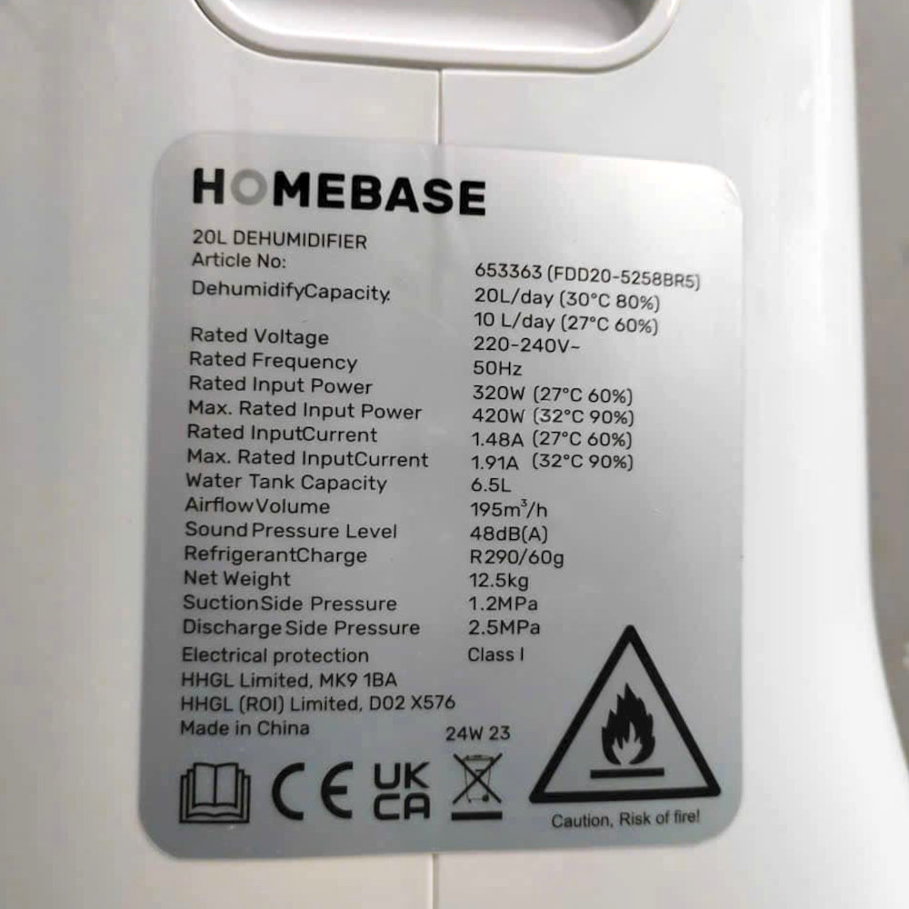 Máy hút ẩm Homebase dung tích 20L dùng cho phòng từ 30-60m2 Tên sản phẩm: Máy hút ẩm Homebase 20L Mã sản phẩm: FDD20-5258BR5 Thương hiệu: Homebase Thái Lan Model: 653363 Công suất hút ẩm: 20L/ngày (30°C 80%) và 10L/ngày (27°C 60%) Dung