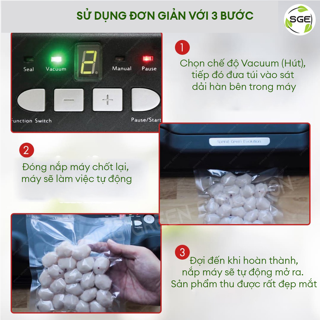 - Khóa nắp từ tính giúp làm việc nhanh hơn. MÁY HÚT CHÂN KHÔNG TỰ ĐỘNG VC88 Máy hút chân không thực phẩm VC88 được thiết kế và phát triển để đáp ứng nhu cầu của các hộ kinh doanh nhỏ, quán ăn, nhà hàng…cần chế biến thực phẩm liên tục trong một thời gian dài với các chức năng đa dạng. Trang bị hộp chứa nước thừa ở phía sau máy, giúp hút chân không các thực phẩm có lẫn (ít) nước mà không lo máy bị hỏng hóc như các dòng máy nhỏ khác. KÍCH THƯỚC THỰC TẾ MÁY HÚT CHÂN KHÔNG VC88 MÁY HÚT CHÂN KHÔNG THỰC PHẨM VC88 CÓ GÌ TỐT? Hỗ trợ hầu hết mọi loại túi, giảm đến 50% chí phí đầu tư Trang bị hệ thông khóa nắp máy Hệ thống nam châm giúp hàn và hút chặt chẽ hơn Chế độ Manual giúp tùy chỉnh thời gian hàn hút chân không Hộp đựng nước thừa trong quá trình hút chân không Dải hàn dày đến 4mm, mối hàn cực kì chắc chắn Lưỡi hút chân không cỡ lớn giúp hút nhanh hơn VC88 GIÚP BẠN TIẾT KIỆM CHI PHÍ TÚI NHƯ NÀO? Bảng so sánh giữa VC88 khi sử dụng với túi hút chân không mặt trơn và máy loại khác khi dùng với túi hút chân không mặt nhám. Có thể nhận thấy “điểm tiết kiệm nhất của việc sử dụng VC88 với túi hút chân không mặt trơn là từ gói thứ 70 trở lên, càng sử dụng nhiều thì chi phí càng giảm”. Tóm lại, nếu sử dụng để kinh doanh hay cho mục đích thương mại với lượng sử dụng từ 7.000 cái trở lên, nên chọn V88 vì sử dụng được với túi hút chân không mặt trơn có giá rẻ hơn nhiều so với túi hút chân không mặt nhám TẠI SAO NÊN CHỌN MÁY HÚT CHÂN KHÔNG SGE?