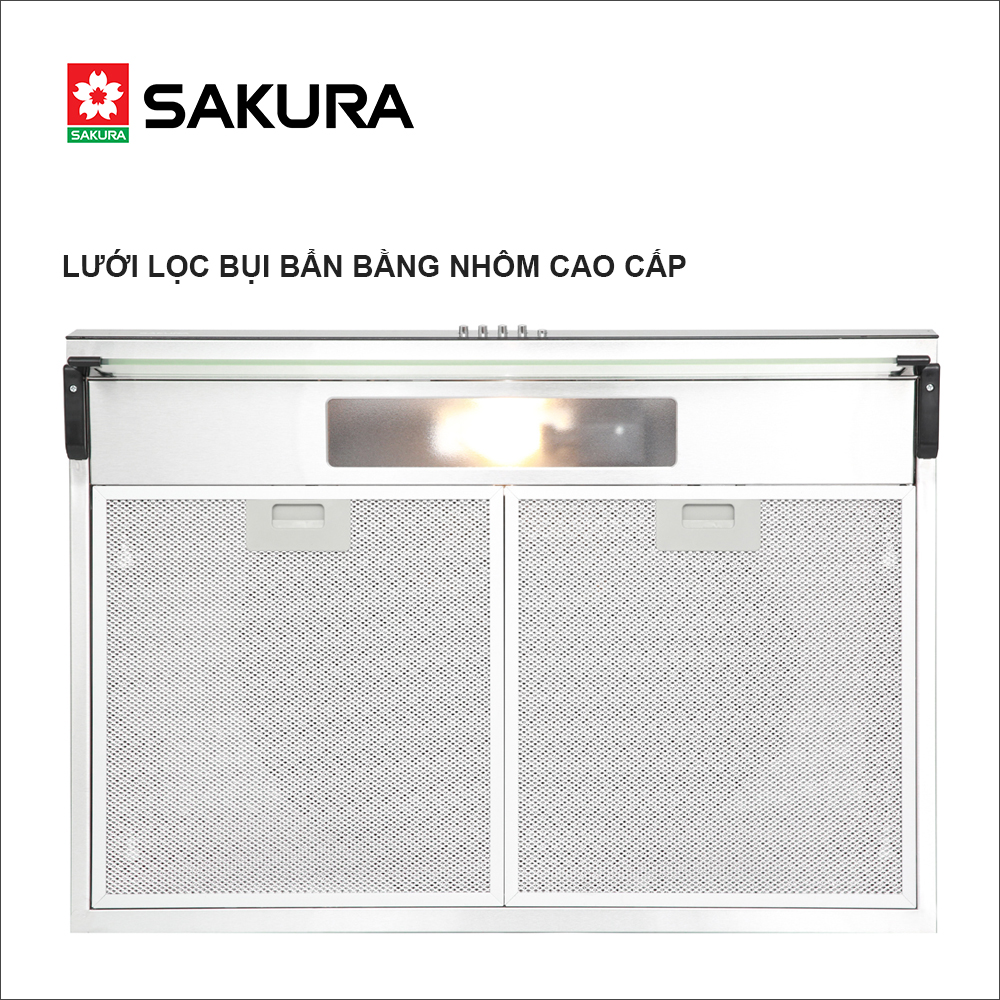 -Máy hút khói SAKURA, treo tủ kệ -Hút - xả trực tiếp bằng ống thoát -Khử mùi bằng than hoạt tính -Thân máy inox -2 motor, 3 nấc tốc độ, 1 đèn chiếu sáng -Lưới