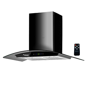 Kiểu máy kính gắn tường - mặt kính cong Chất liệu Inox - kính Màn hình LCD Điều khiển bằng cảm ứng - hẹn giờ tắt Khử mùi bằng than hoạt tính, ống thoát Ø150