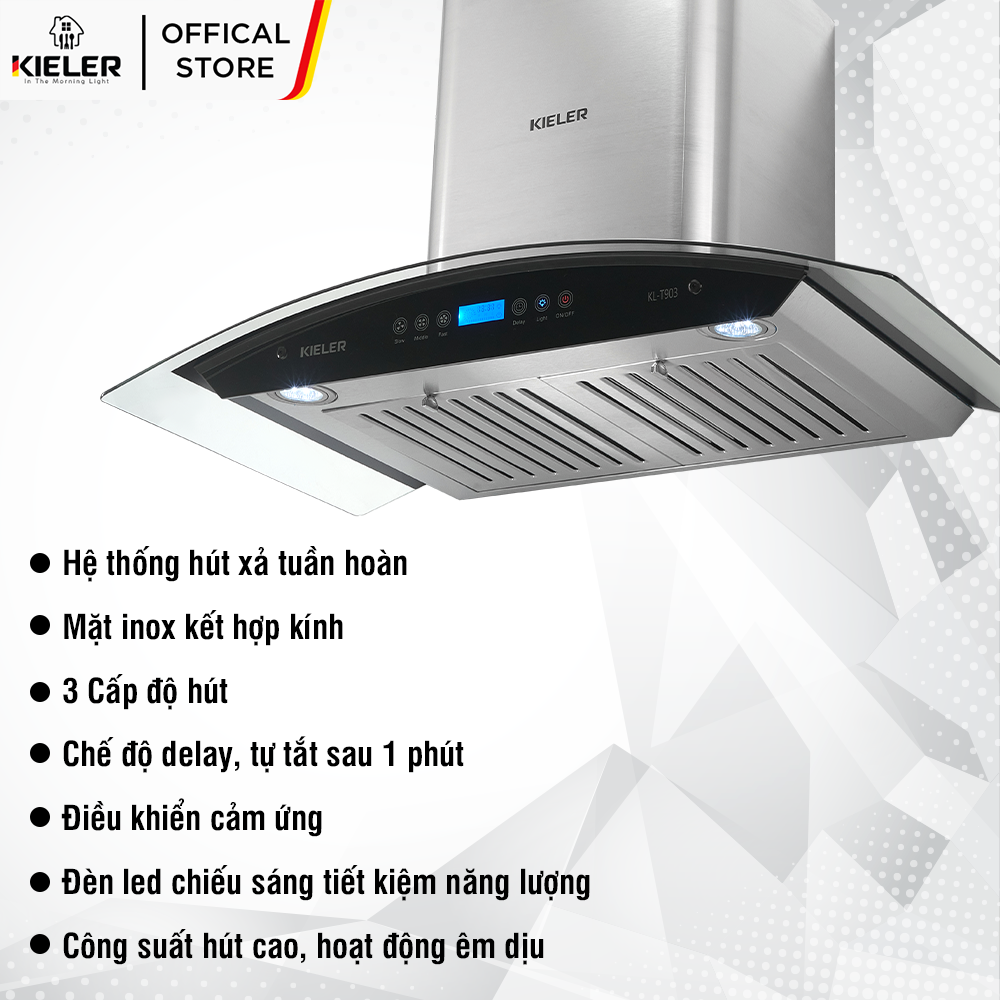 - Tên sản phẩm: Máy hút mùi gắn tường Kieler KL-T903 điều khiển cảm ứng, chế độ delay tự tắt - Miễn Phí Vận Chuyển Và Lắp Đặt