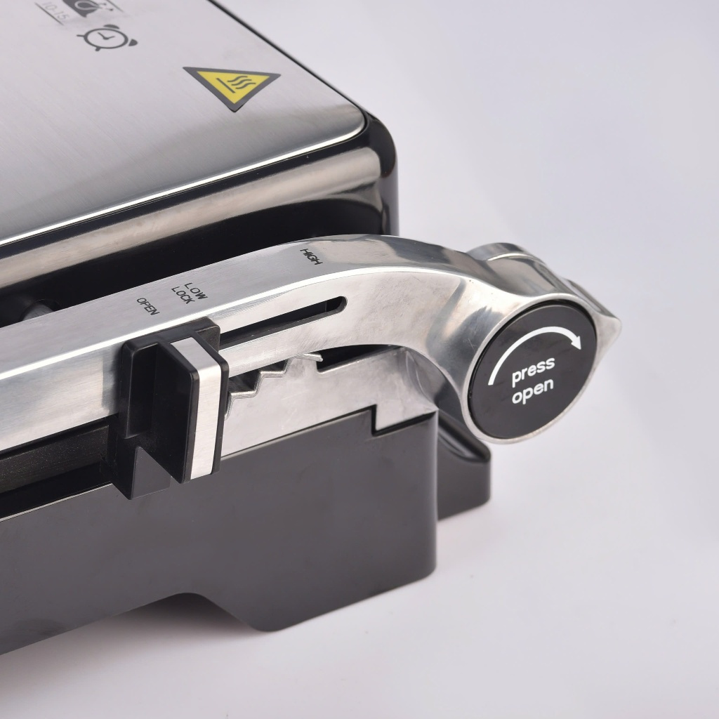 - 4 mức điều chỉnh góc mở kẹp nướng, góc mở tối đa lên đến 180 độ và bạn có thể sử dụng như 1 chiếc vỉ nướng điện thông thường. Máy kẹp nướng bánh mỳ có kèm theo khay hứng dầu rất tiện lợi.