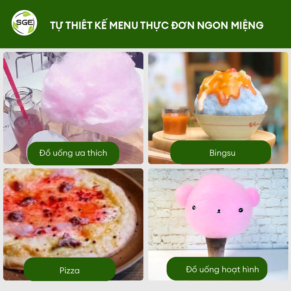 Máy kẹo bông Có thể làm kẹo bông mềm, sản xuất nhanh. Thích hợp để làm kẹo bông để bán bởi vì nó có năng lực sản xuất cao dùng nguyên liệu ít và sử dụng bền lâu. Máy cũng có thể sử dụng cho các event, sự kiện hay tổ chức hoạt động cho trẻ nhỏ do máy sử dụng được lâu dài.