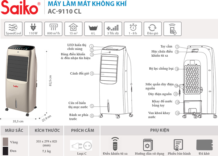 Máy Làm Mát Không Khí Saiko AC-9110CL (110W) được thiết kế nhỏ gọn, có tích hợp 4 bánh xe để dễ dàng di chuyển từ chỗ này sang chỗ khác mà không sợ làm ảnh hưởng đến nền nhà. Cánh quạt được lồng gọn gàng vào sâu bên trong giúp giảm độ ồn tối đa khi quạt hoạt động, đồng thời bảo đảm an toàn cho trẻ nhỏ và các thành viên trong gia đình.