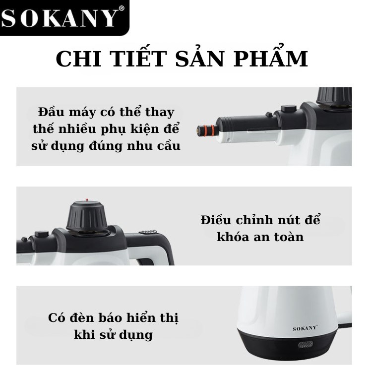 - Với áp suất lớn, máy xịt rửa SOKANY - đi sâu vào các kẽ hở để loại bỏ bụi bẩn bằng hơi nước dễ dàng. HƯỚNG DẪN SỬ DỤNG CỦA MÁY LÀM SẠCH BẰNG HƠI NƯỚC SOKANY: