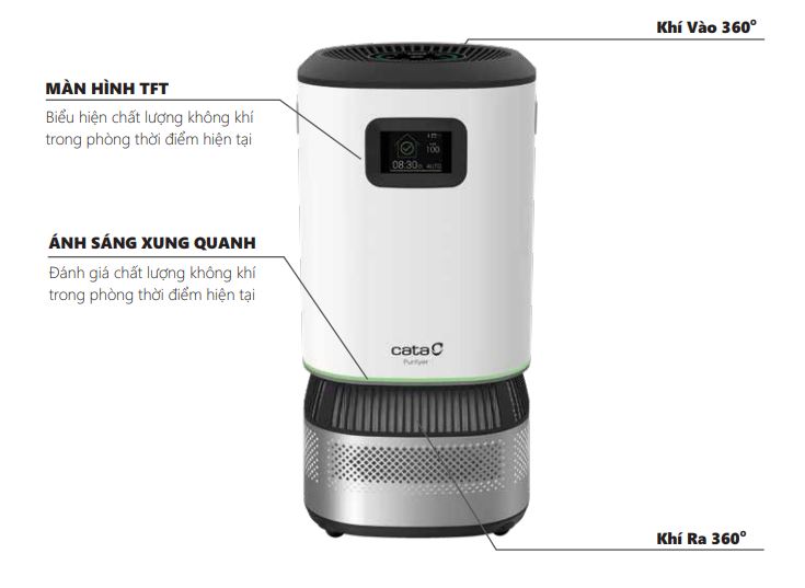• CATA PURIFYER – HOME PRO hút không khí bẩn và đẩy khí sạch ra môi trường 360 độ giúp cho quá trình thu và lọc không khí hiệu quả và tốc độ nhanh hơn so với các sản phẩm tương tự.