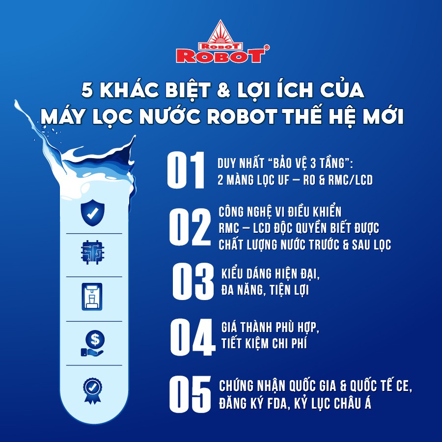 • Công nghệ RMC – LCD độc quyền, biết được chất lượng nước trước & sau lọc   Bộ vi mạch RMC-LCD thông minh thiết kế phát minh của ROBOT, mọi chi tiết vận hành máy được hiển thị trên màn hình LCD, cảnh báo mọi rủi ro cho người sử dụng   Tuổi thọ lõi lọc được tính theo lưu lượng nước sử dụng, không tính theo thời gian ghim điện như các máy thông thường, tiết kiệm tối đa chi phí thay lõi lọc