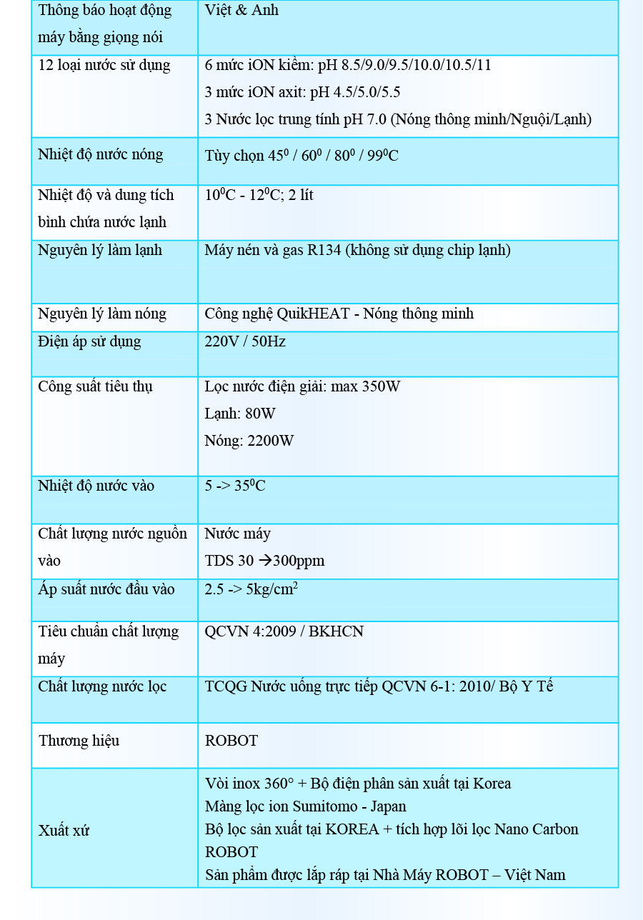 • Hệ thống điều khiển cảm ứng trên mặt phủ kính với màn hình LCD tinh tế     Với mong muốn nhiều gia đình Việt có thể sử dụng nước điện giải iON kiềm với chi phí hợp lý để bảo vệ sức khỏe, sắc đẹp & nâng cao chất lượng cuộc sống, ROBOT mang đến sản phẩm “Chất lượng Quốc tế - Giá thành Việt Nam”, phù hợp với mức sống của nhiều người. Tiết kiệm cho người tiêu dùng đến hơn một nửa chí phí so với máy nhập khẩu chỉ từ 30 – 50%, nhưng sở hữu nhiều ưu điểm, tính năng vượt trội, chất lượng cao.  Chế độ bảo hành chính hãng, tận nơi, vật tư và linh kiện, lõi lọc luôn có sẵn hạn chế tối đa chi phí sửa chữa, bảo trì.     VĐV Cầu Lông Nguyễn Tiến Minh – tay vợt từng đứng Top 5 Thế Giới chia sẻ: Sau một thời gian sử dụng Máy lọc nước điện giải iON kiềm Minh thấy cải thiện sức khỏe rất nhiều và tốc độ hồi phục sau tập luyện, thi đấu cũng nhanh hơn so với trước đây. Bây giờ mỗi khi đi tập, hay khi đi thi đấu, Minh đều mang theo nước iON kiềm để uống. ROBOT là một thương hiệu Việt Nam uy tín nên Minh hoàn toàn tin tưởng và lựa chọn Máy lọc nước điện giải iON kiềm ROBOT.     Ghi chú:  Chỉ số thiết kế Hydrogen, ORP tuỳ theo số tấm điện cực, điều kiện đo trong phòng thí nghiệm chuyên nghiệp, đạt chuẩn (tham khảo kết quả kiểm nghiệm).