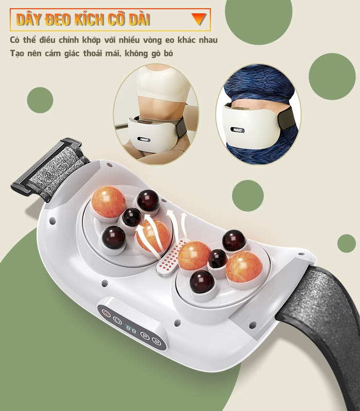 Điều chỉnh nhiệt độ thông minh với 4 cấp độ (35-65℃) 5 chế độ rung Làm ấm nhanh, nhiệt độ nóng ổn định tạo cảm giác massage thoải mái. Không ồn Dây đai đàn hồi