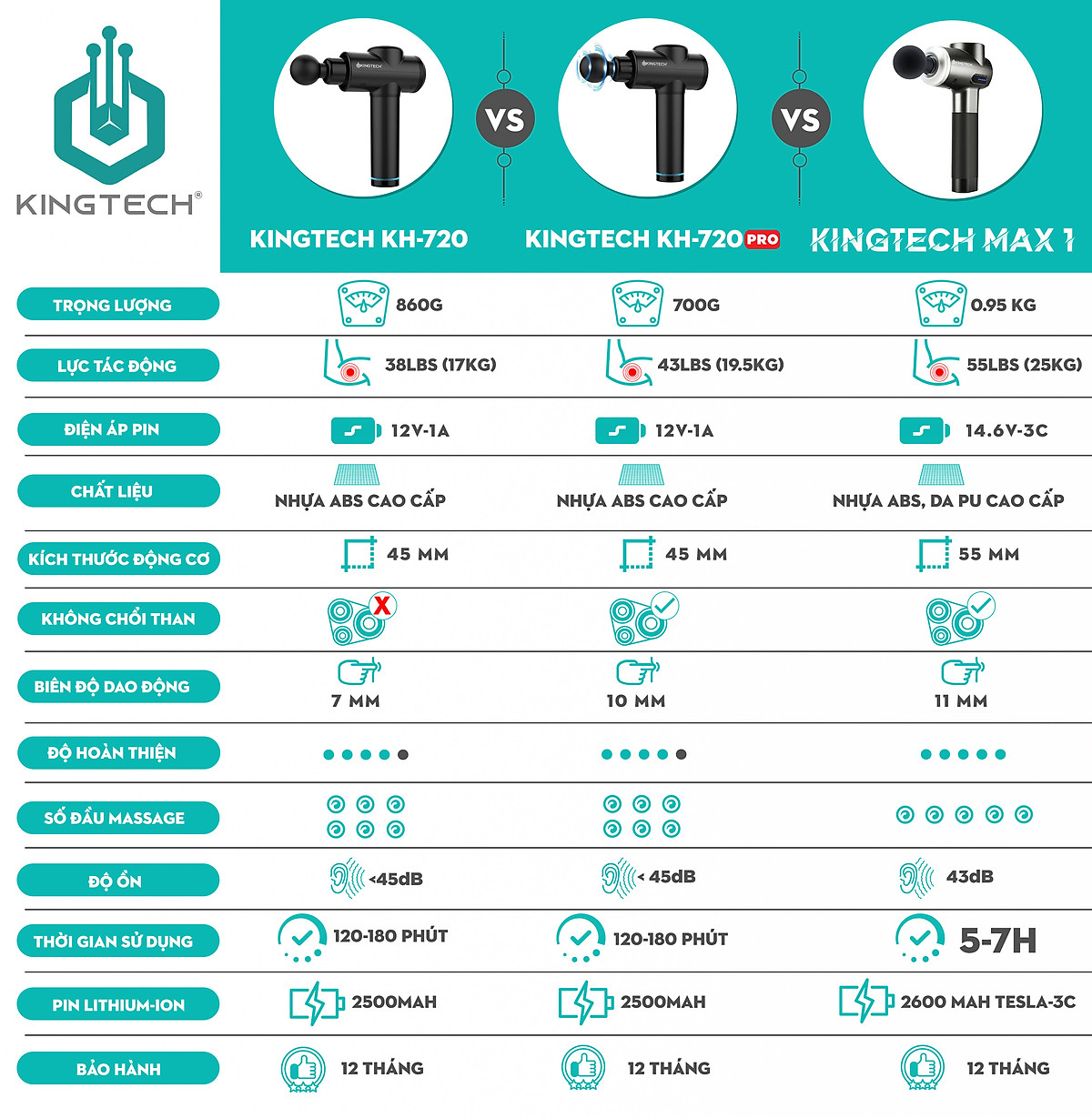 - ĐẦU MASSAGE CÓ THỂ THÁO RỜI: KINGTECH KH-720 Pro có sẵn 6 loại đầu massage để đáp ứng nhu cầu của các cơ khác nhau. Đầu massage có thể được tháo ra để dễ dàng lắp đặt và vệ sinh.