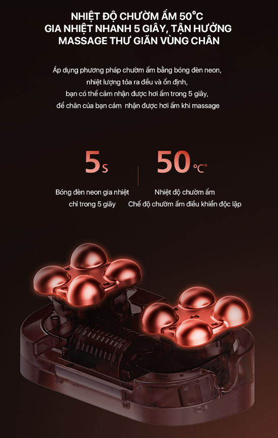 Cài đặt nhiệt độ mong muốn trong khoảng 35-48˚C, có 2 tiếng Bíp kêu khi nhiệt độ đạt được mức cài đặt. Có 8 đèn hồng ngoại tập trung ở dưới gan bàn chân. Có