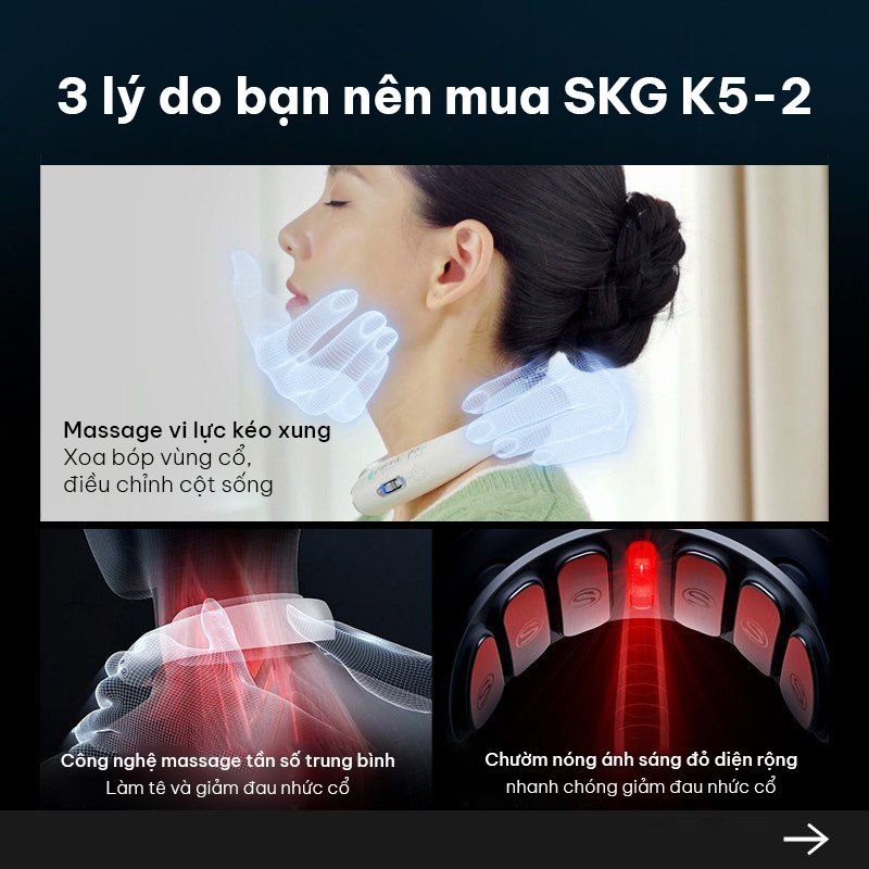 ** Thông Tin sản phẩmMáy Massage Cổ SKG K5-2 giúp giảm đau do thoái hóa, thoát vị đĩa đệm cổ, đau mỏi do sai tư thế với xung điện, chườm nóng