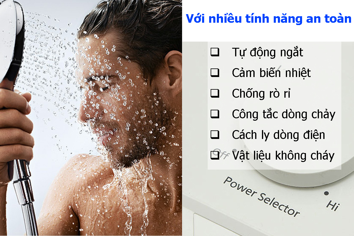 Đặc điểm nổi bật Máy nước nóng làm nóng trực tiếp nhanh chóng cùng công suất 4500W Vòi sen 5 chế độ phun cho phép người dùng điều chỉnh tùy theo nhu cầu Cầu dao