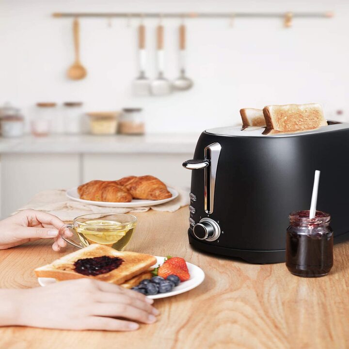 Công suất 900W cùng 8 mức điều chỉnh nhiệt độ nướng khác nhau Chất liệu thép không gỉ và nhựa, an toàn với thực phẩm không chứa BPA cùng 2 khe nướng Định tâm tự