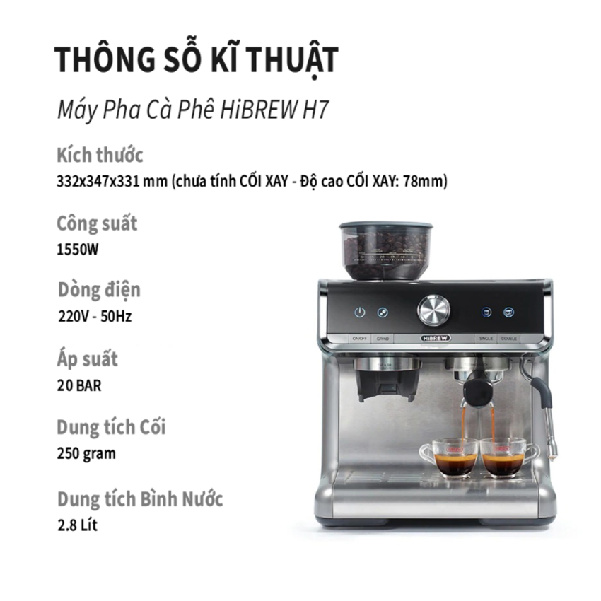 - Máy pha cà phê Espresso chuyên nghiệp 3 trong 1 HiBREW H7 có công suất hoạt động là 1550W, áp suất 20 bar cho phép pha tối đa 40 - 50 ly/ngày. Nhờ đó đáp ứng được nhu cầu sử dụng tại các văn phòng, quán cà phê, khách sạn Công nghệ xay cảm biến hiện đại