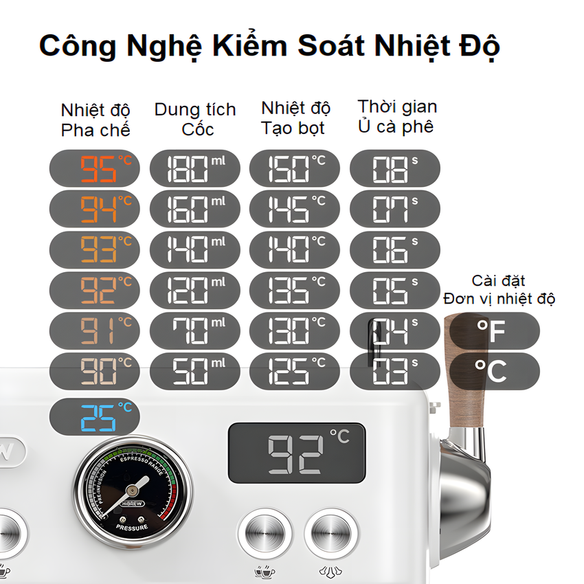 - Linh hoạt kiểm soát nhiệt độ pha chiết suất cà phê 90~95ºC