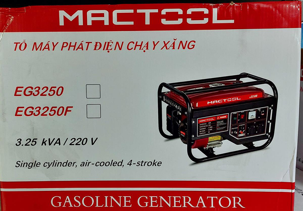 Thông tin hữu ích về máy phát điện Mactool EG6875F: Công suất định mức: 6.5 kW (8.1 kVA) Công suất tối đa: 7.0 kW (8.8 kVA) Điện áp định mức: 220 V Dòng điện định